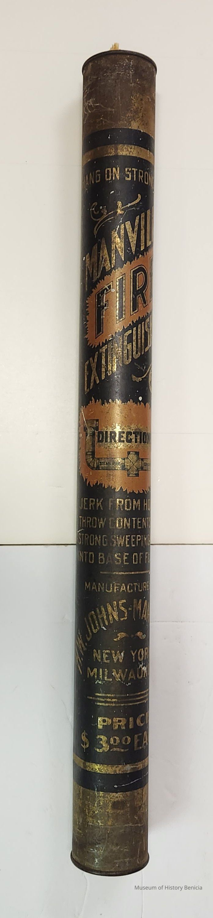 Label: Hang on Strong Hook / Manville Fire Extinguisher / Directions: Jerk from hook and throw contents with strong sweeping motion into base of flames. / Manufactured by H. W. Johns-Manville Co. / New York - Milwaukee. / Price $3.00 eachCollection