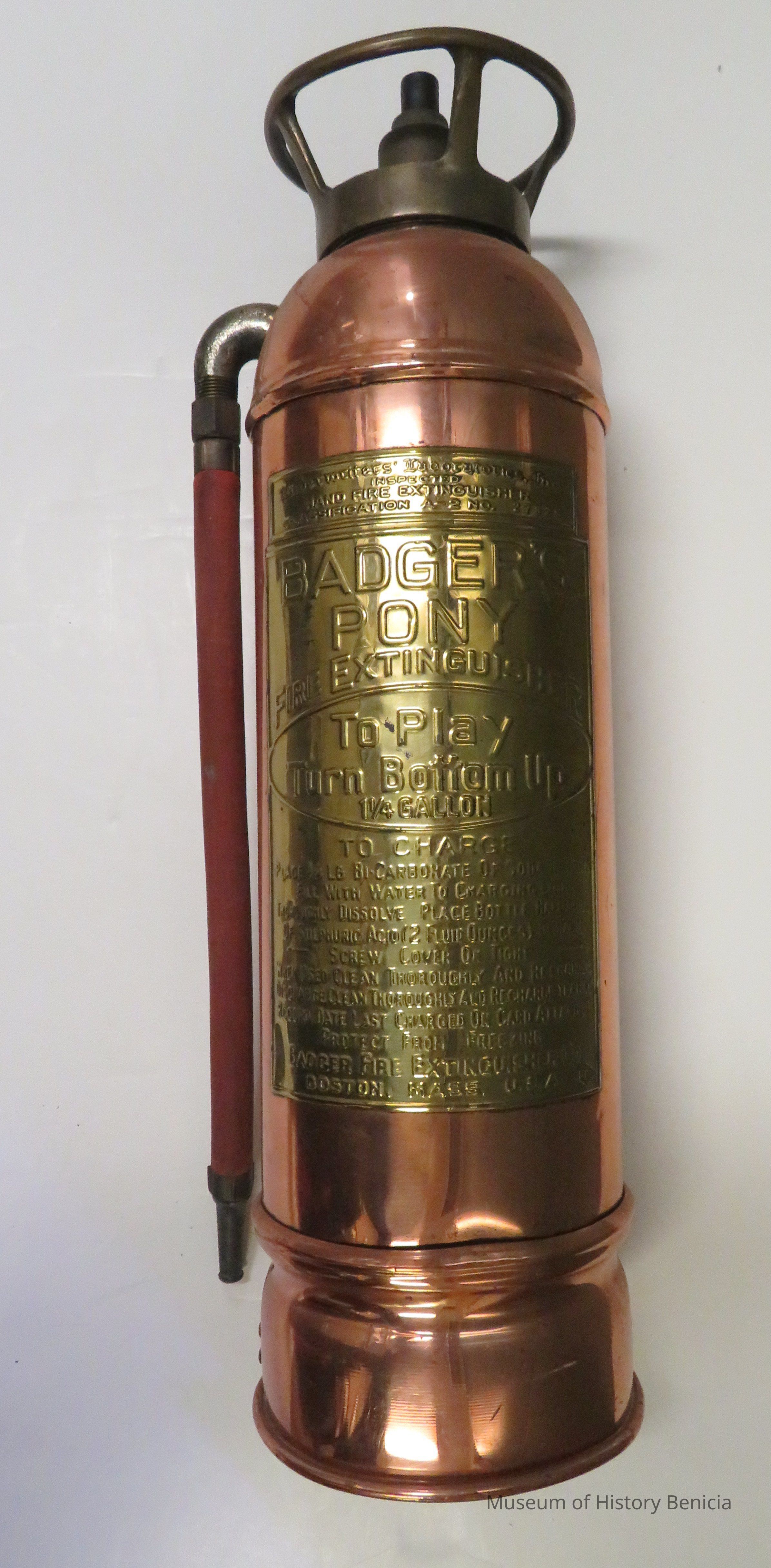 Copper fire extinguisher inscribed with Badger's Pony Fire Extinguisher. Made in Boston, Mass.