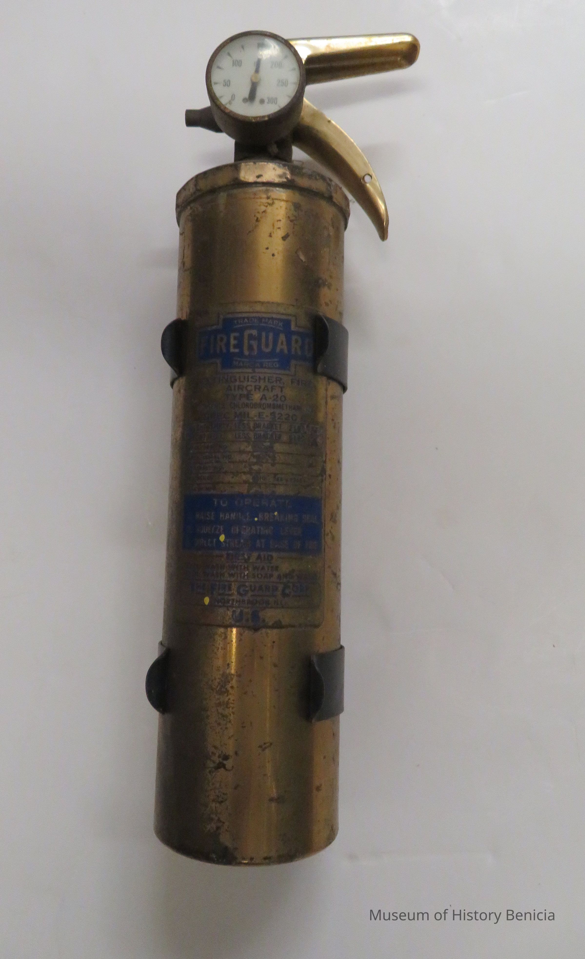 Goldish medal canister with gage at the top and black metal wall holder. Trademark Fireguard. The Fireguard Corp., Northbrook, Ill. U.S.