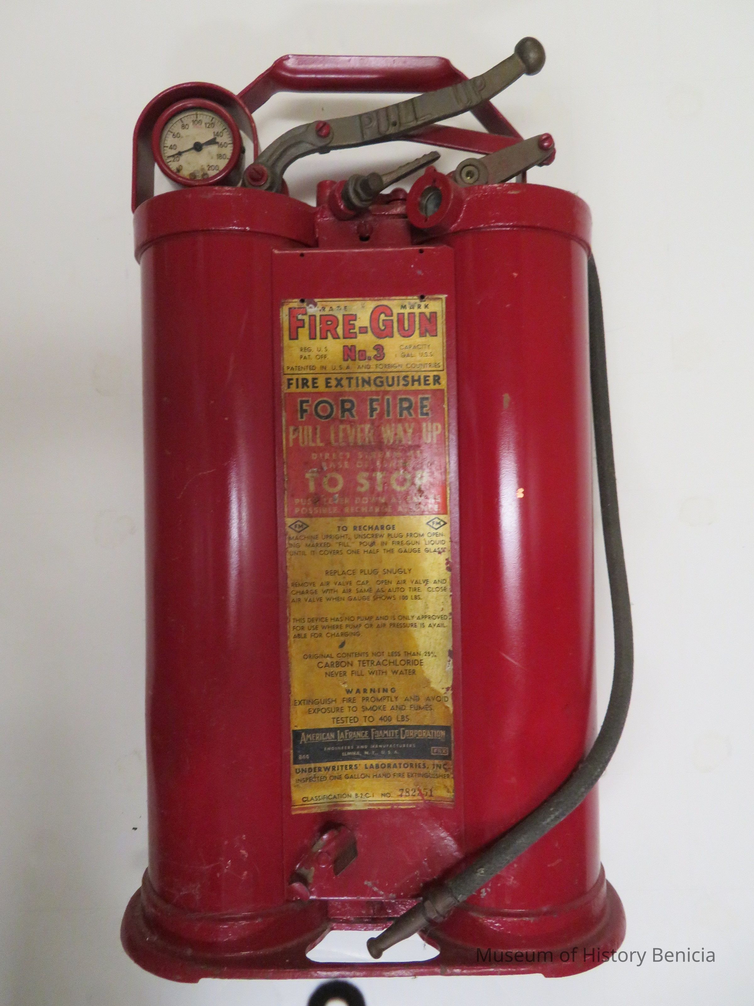 Fire-Gun No.3 Fire Extinguisher. It has levers and a guage on top.