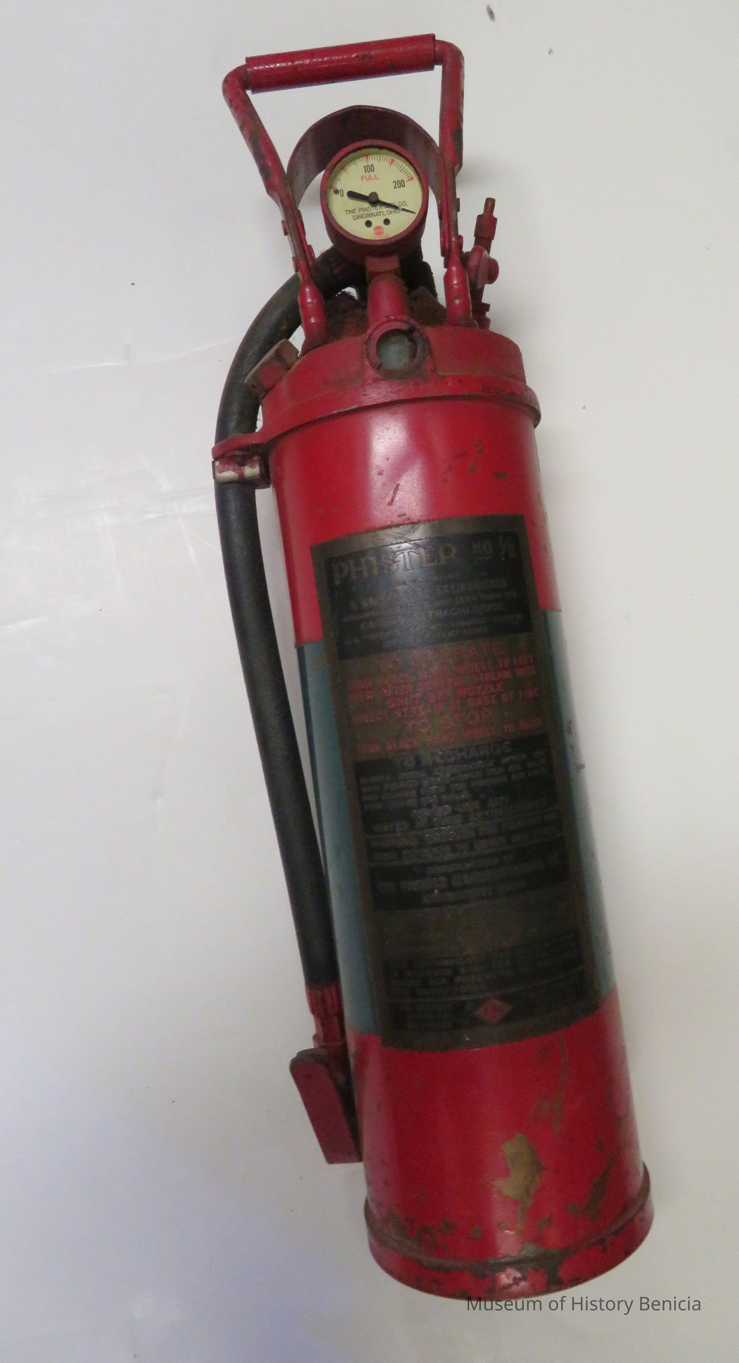 Red painted fire extinguisher with gage on top. Inscripted with Phister No. 1/2.
