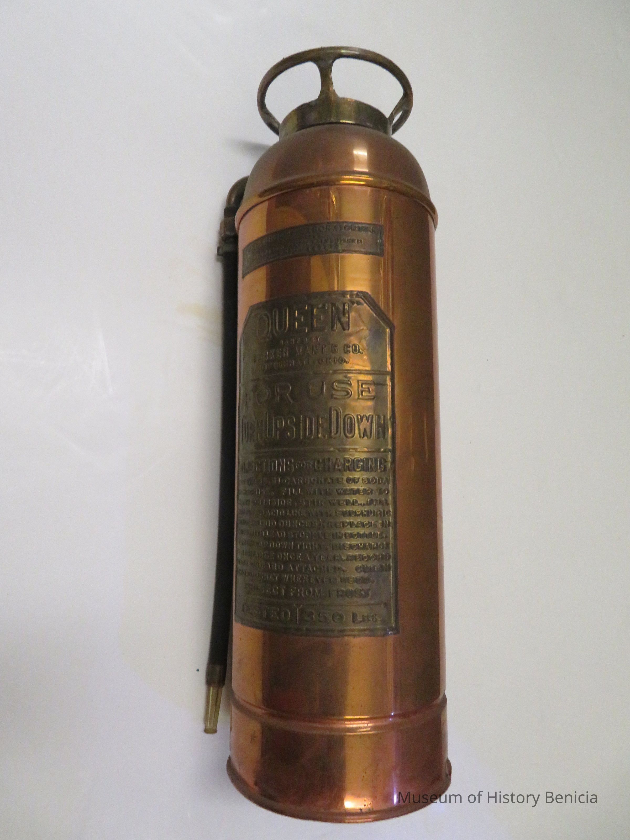 Copper fire extinguisher, 2 1/2 gallons. Inscribed with "tested 350 lbs. Underwriters Laboratories Inspected. "Queens" manufactured by Harper Man'f'g Company. Cincinnati, Ohio.Collection
