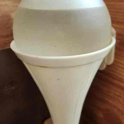 Slightly frosted, glass "light-bulb-shaped" container part of Fire Grenade Demo Kit; about three-quarters full of a clear liquid; sits in a funnel attached to the inside of the kit/boxCollection