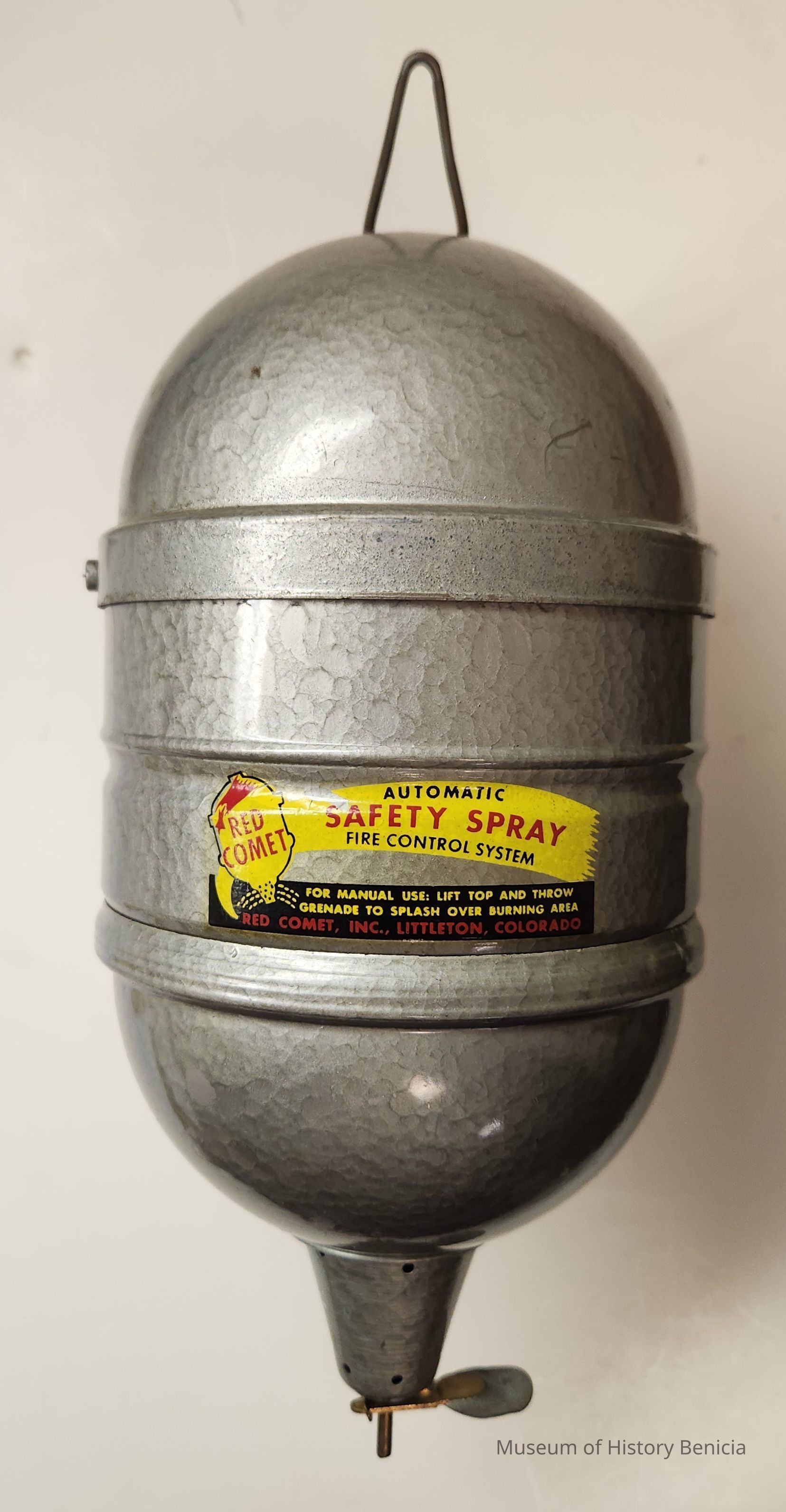 Oblong-shaped metal container part of Fire Grenade Demo Kit; gray with a triangle piece for hanging; it hangs from a metal bracket inside the kit/box; metal piece at the bottom to regulate flow of liquid; removable lid for refillingCollection