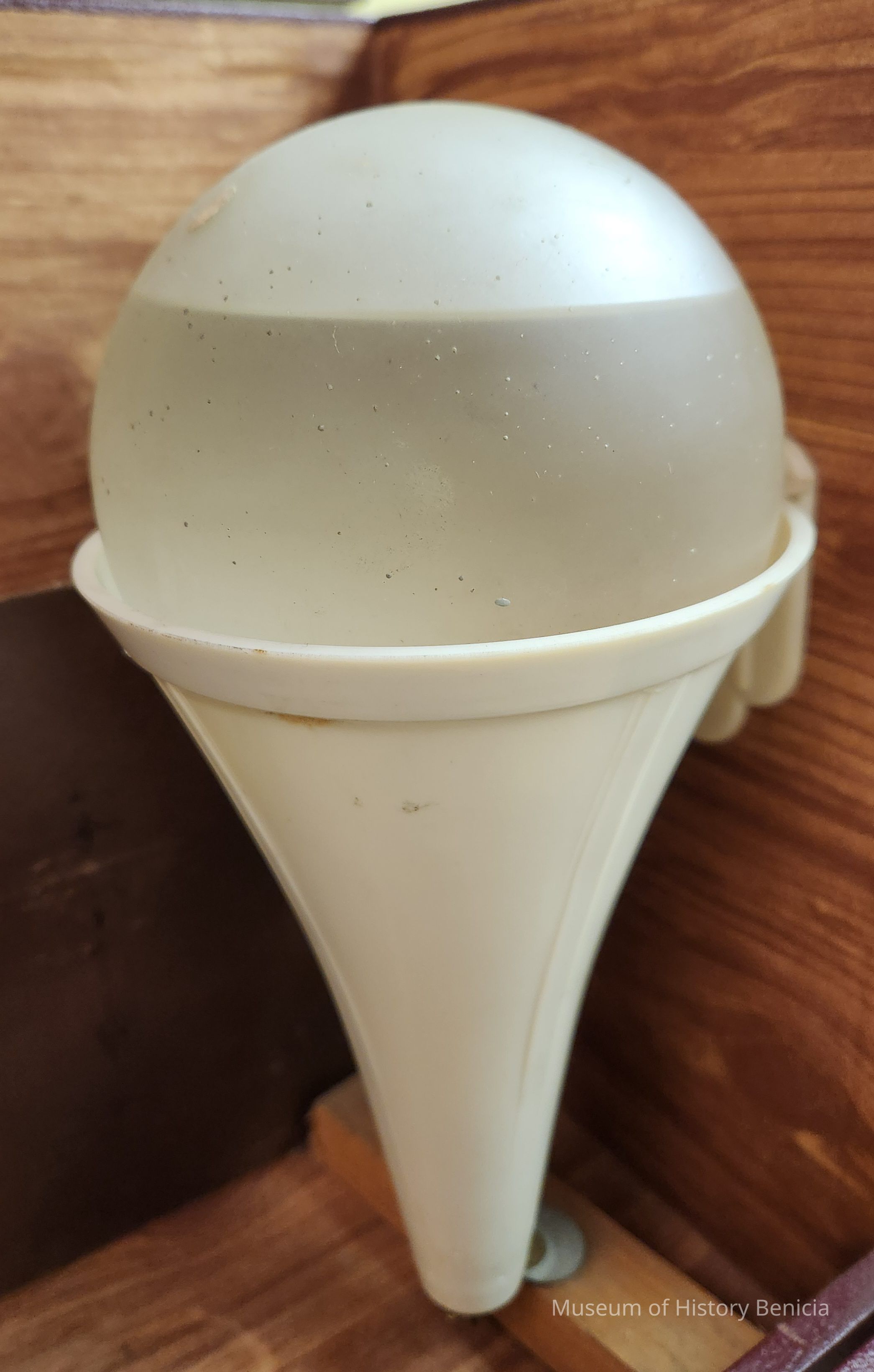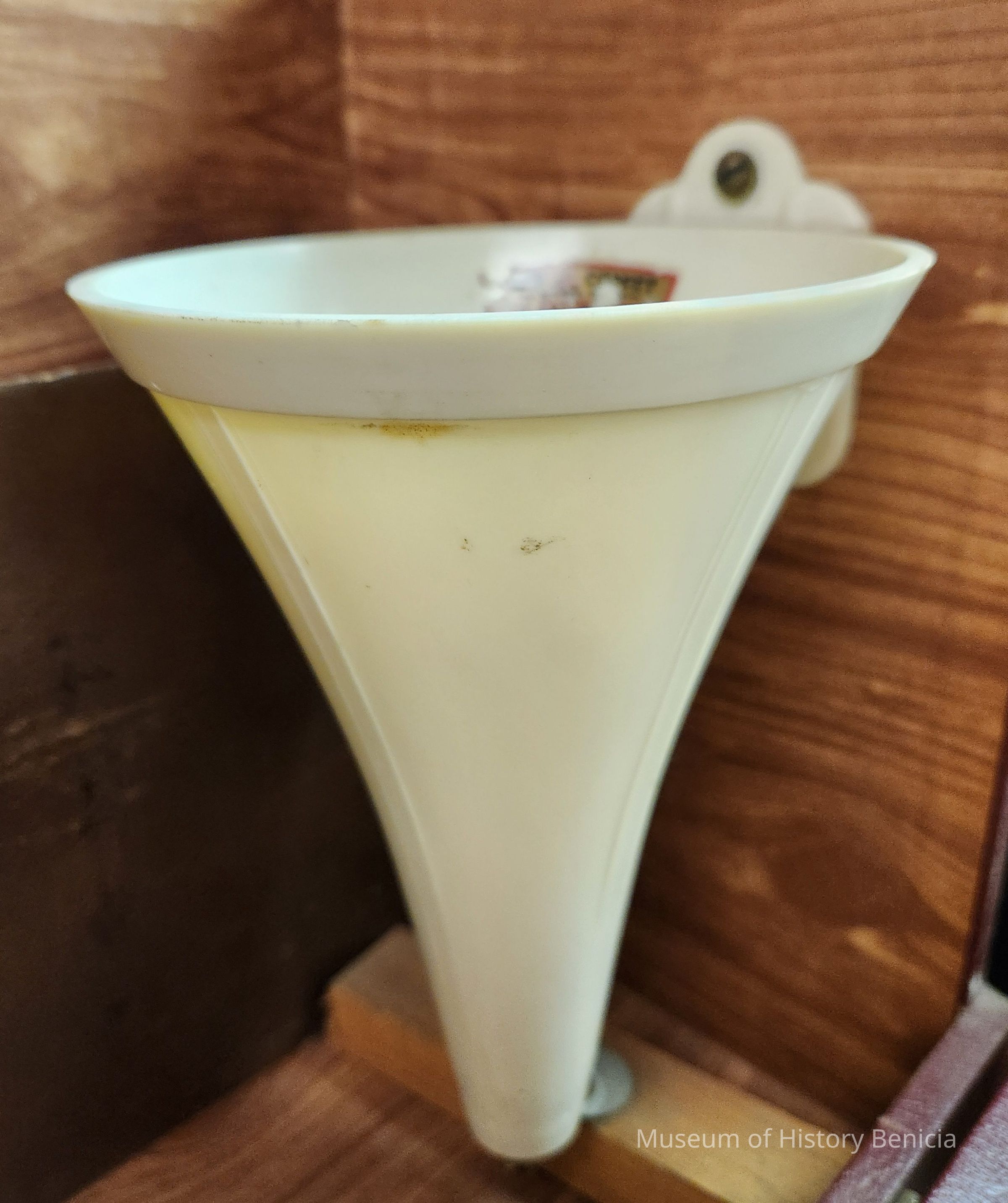Plastic funnel part of Fire Grenade Demo Kit; off white color with attached bracket for mounting to the wall; holder for "light-bulb-shaped" glass containerCollection