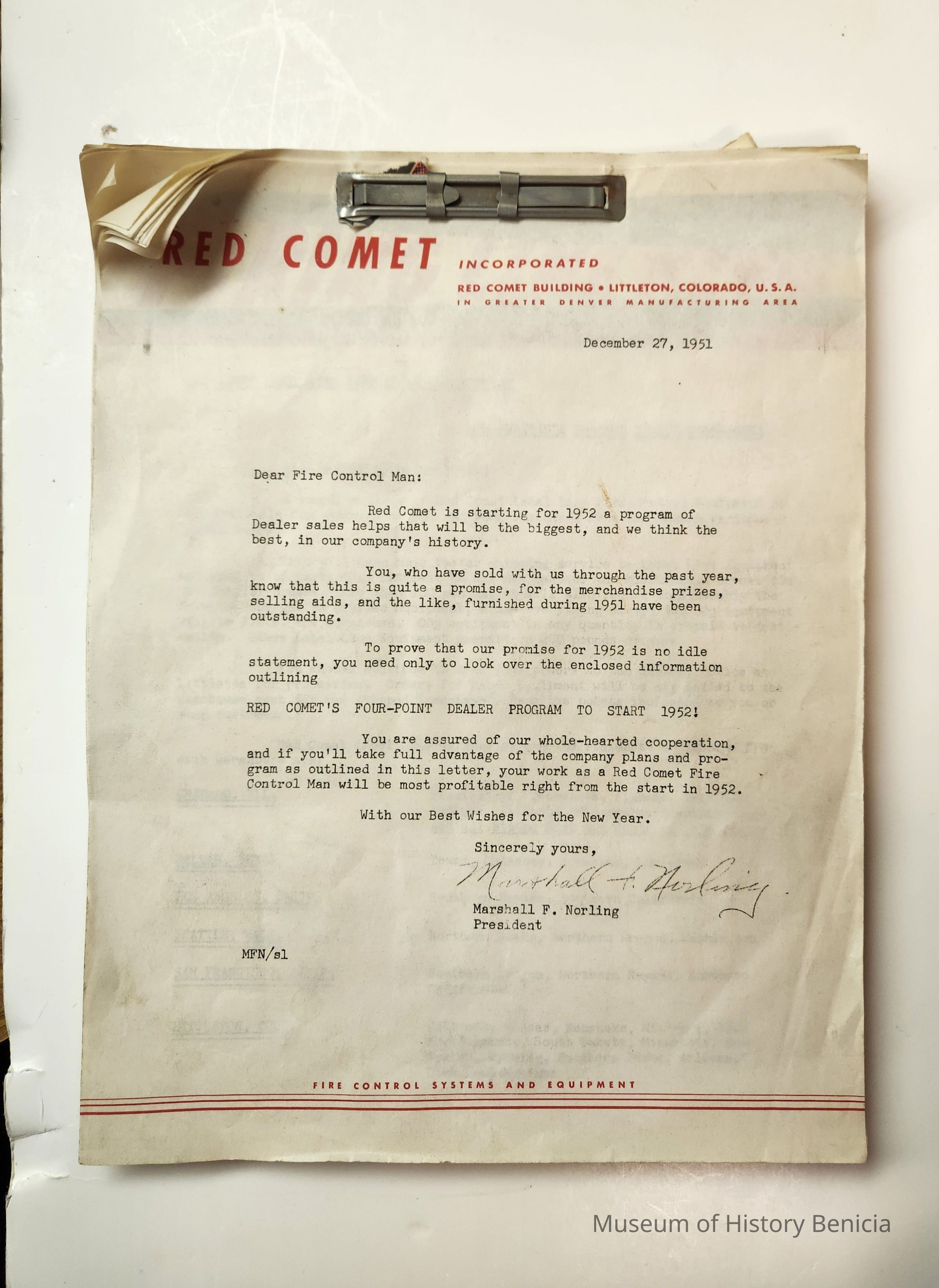 Information Packet for Salesman dated December 27, 1951 part of Fire Grenade Demo Kit; includes letters from the company, locations of warehouses, ads for products, help and instructions for installing equipment, results of testing for safety, costs to salesmen 40 pages - one sided except for four dealing with pricing; bound at the top with two hole clipCollection