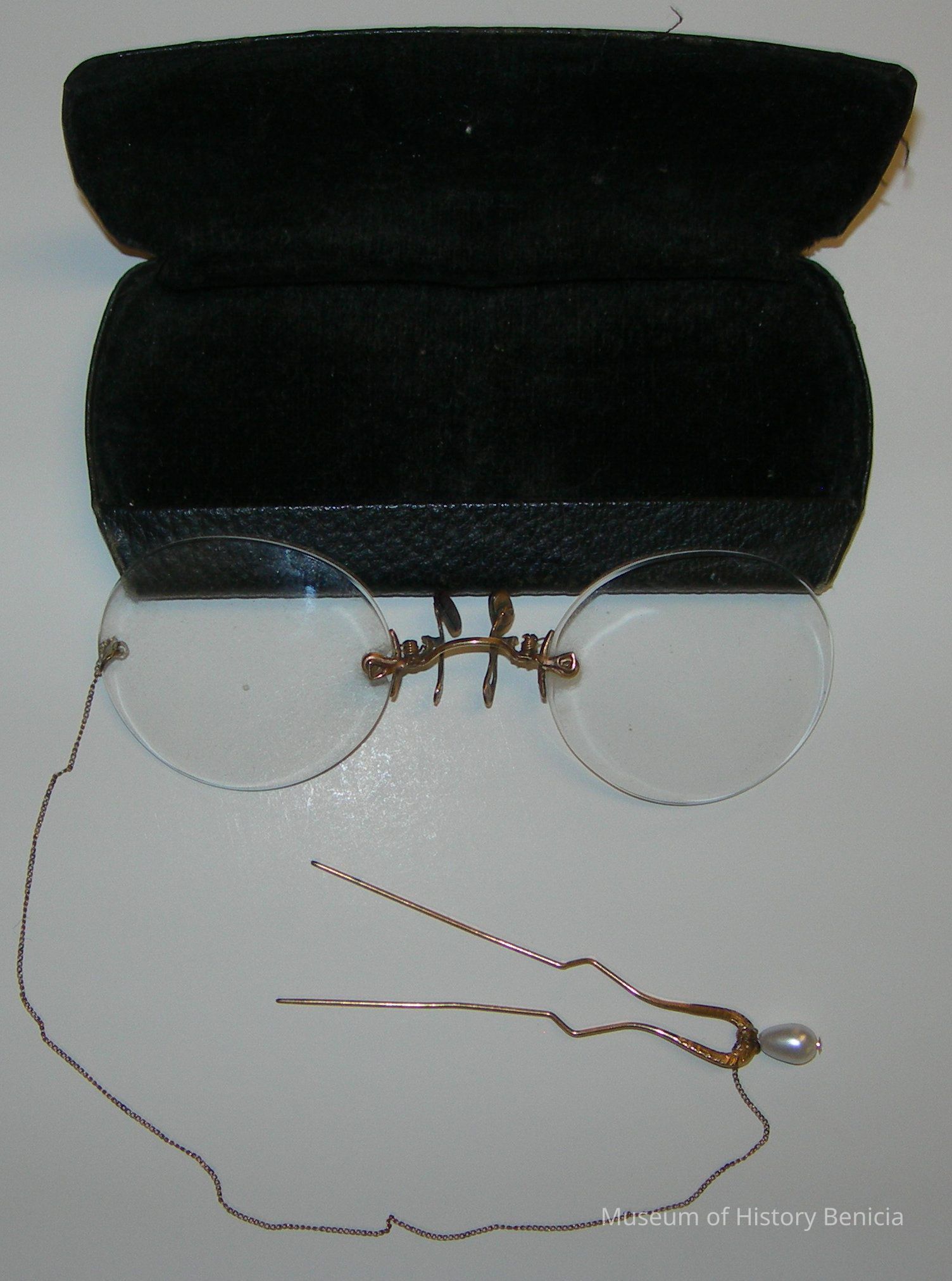Eye glasses with case, oval shaped glass lenses, rimless, Pince-Nez style, nose resting, chain from side is 10-1/2" long with pin to attach to shirt/jacket/sweater; there is an oval pearl attached to the open 2-3/4" long pinCollection