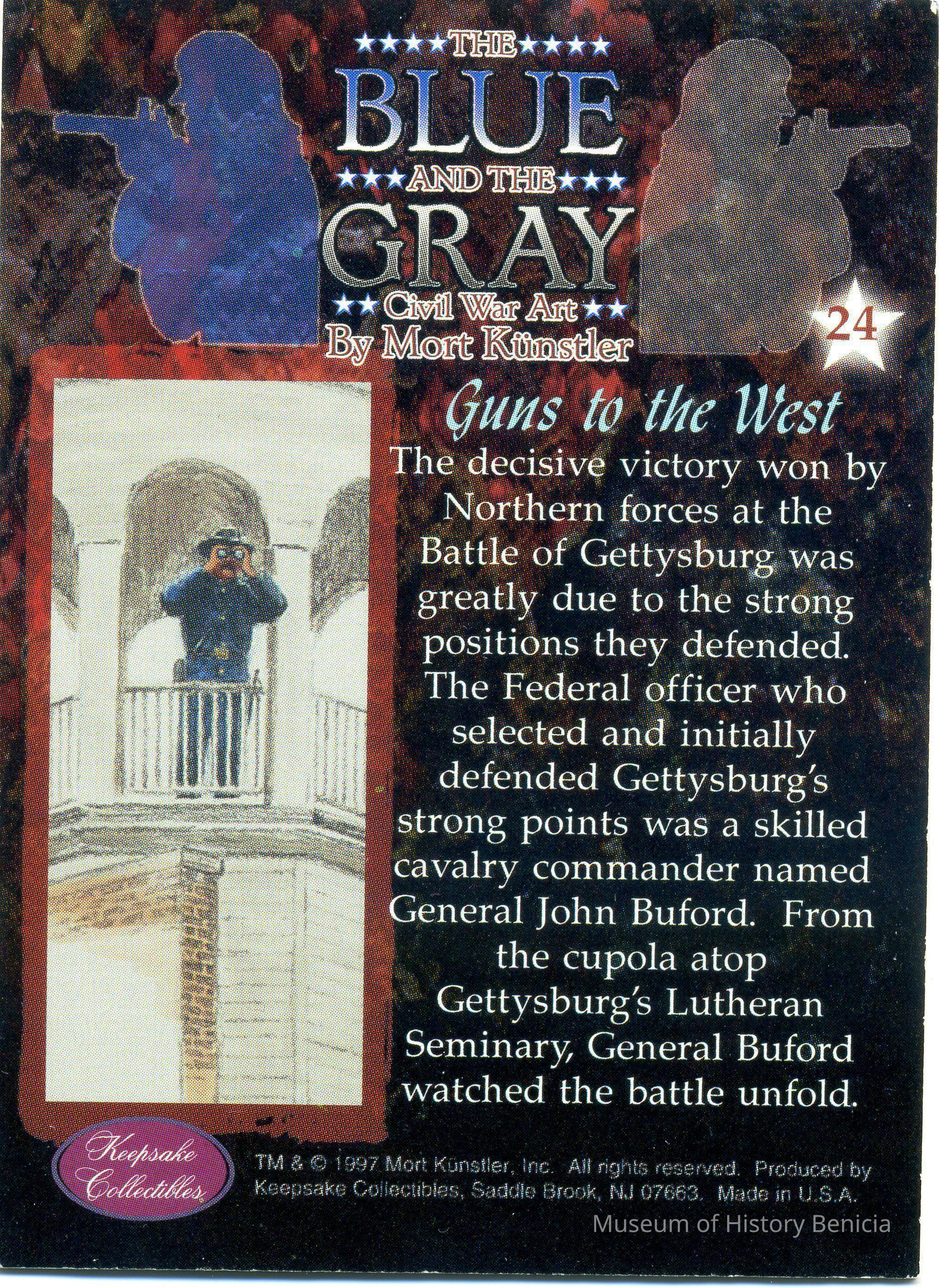 A collectors card for the Civil War from the Keepsake Collectibles company. The set is called "The Blue and the Gray - Civil War Art by Mort Kunstler. Each card has a scene/person on one side and the history of that scene or person on the other side.