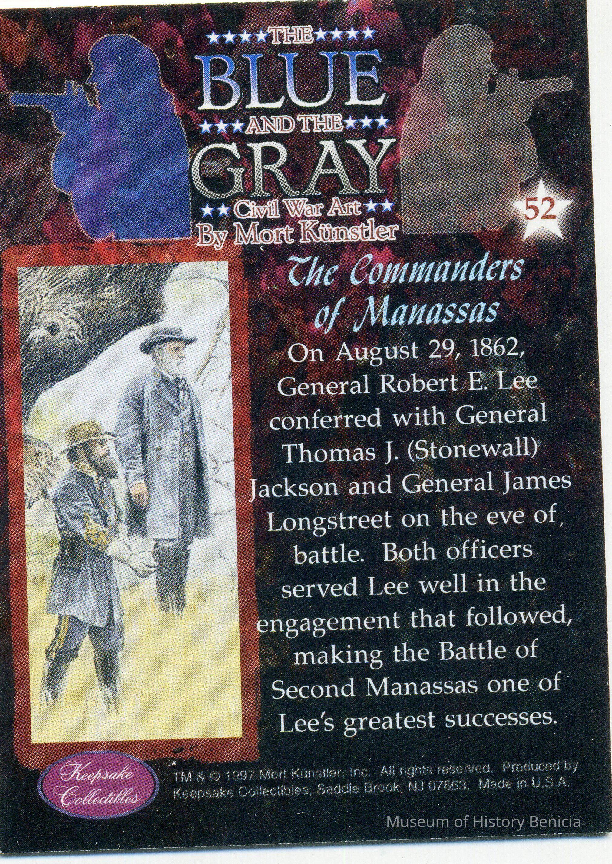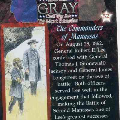 A collectors card for the Civil War from the Keepsake Collectibles company. The set is called "The Blue and the Gray - Civil War Art by Mort Kunstler. Each card has a scene/person on one side and the history of that scene or person on the other side. This card (#52) is called "The Commanders of Manassas". It talks about the 2nd battle on Manassas and Lee conferring with Gen Stonewall Jackson and Gen Longstreet. There is only one of these cards.