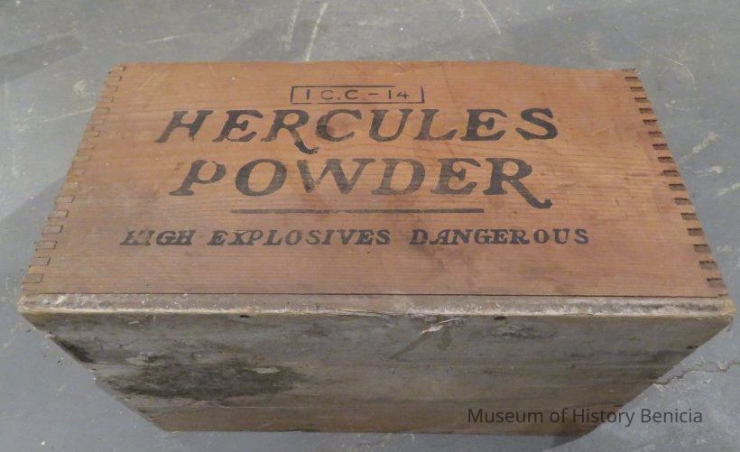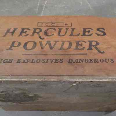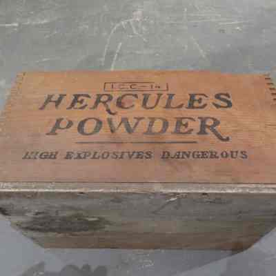 Wooden box with dove tail corners "Hercules Powder High Explosive Dangerous" on the 2 long sides. Very faded verbage on short sides. Inside there is an assortment of tool attachments.