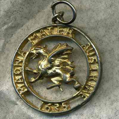 Medallion/Charm - 1-3/8" diameter; round, gold painted metal; winged dragon in center; around the edge: Magna Mater Austriae 1635