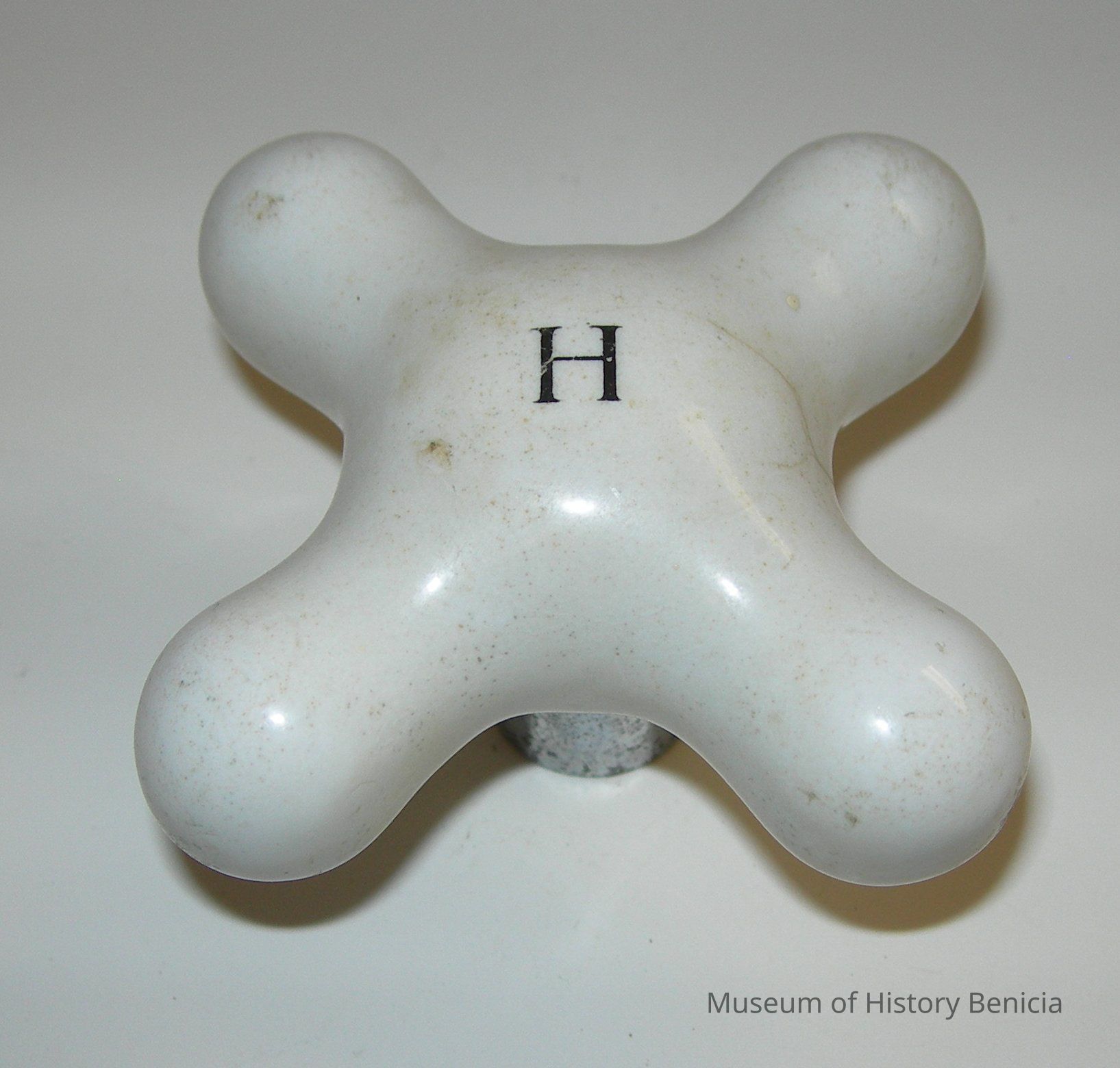 Faucet Handle, "X" shape, white porcelain; metal base; inside threaded; with letter "H" in center top; 3-1/4" x 3-1/4" x 1-3/4"