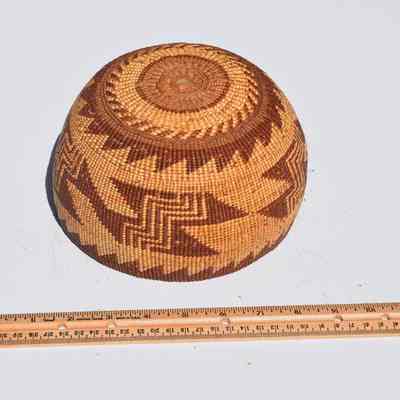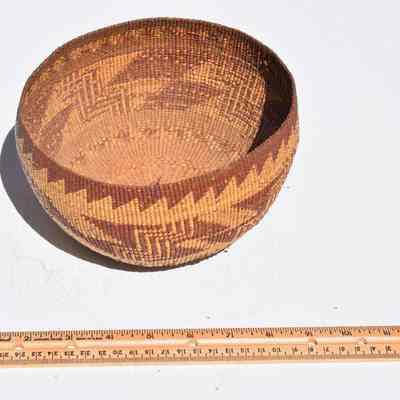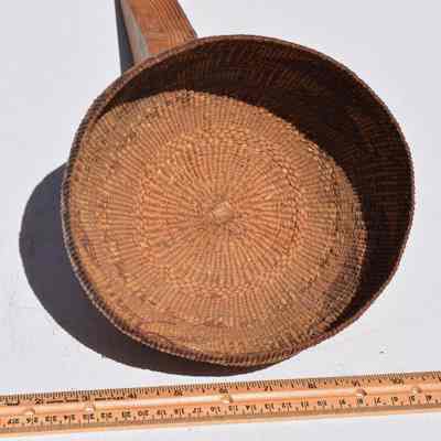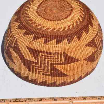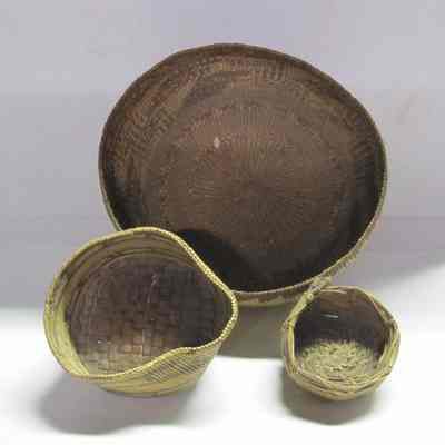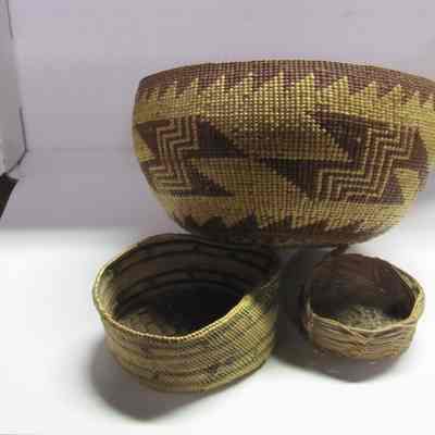 This is one of three baskets made by Native Americans. Not sure of which tribe but a note that came with them says they are"Northwest California Indians". The baskets are made of Willow and Spruce. One of the baskets was used for Acorn mash boiling.
