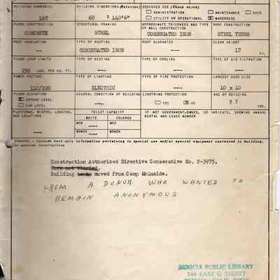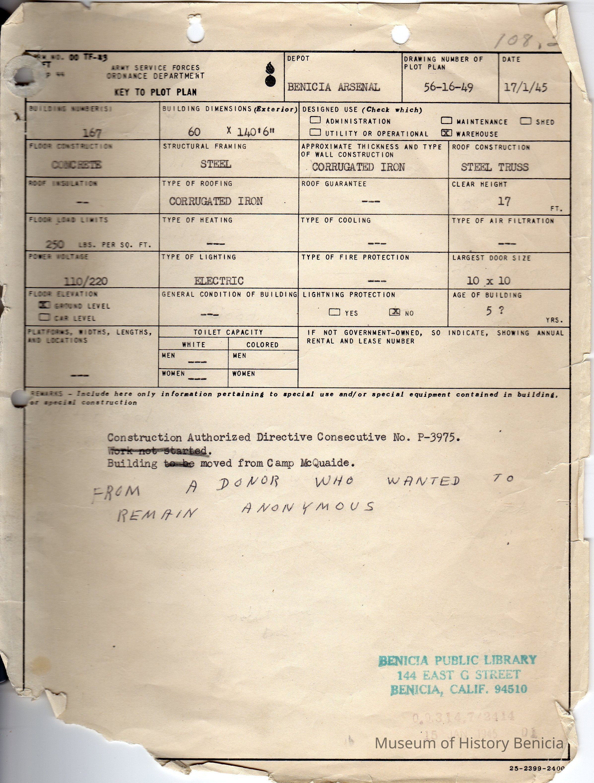 Benicia Arsenal Document. Form No. OO TF-43 SPOFT dated Jan. 17, 1945. Army Service Forces Ordnance Department, Key to Plot Plan, Building 167. Building moved to Benicia Arsenal from Camp McQuiade.Collection