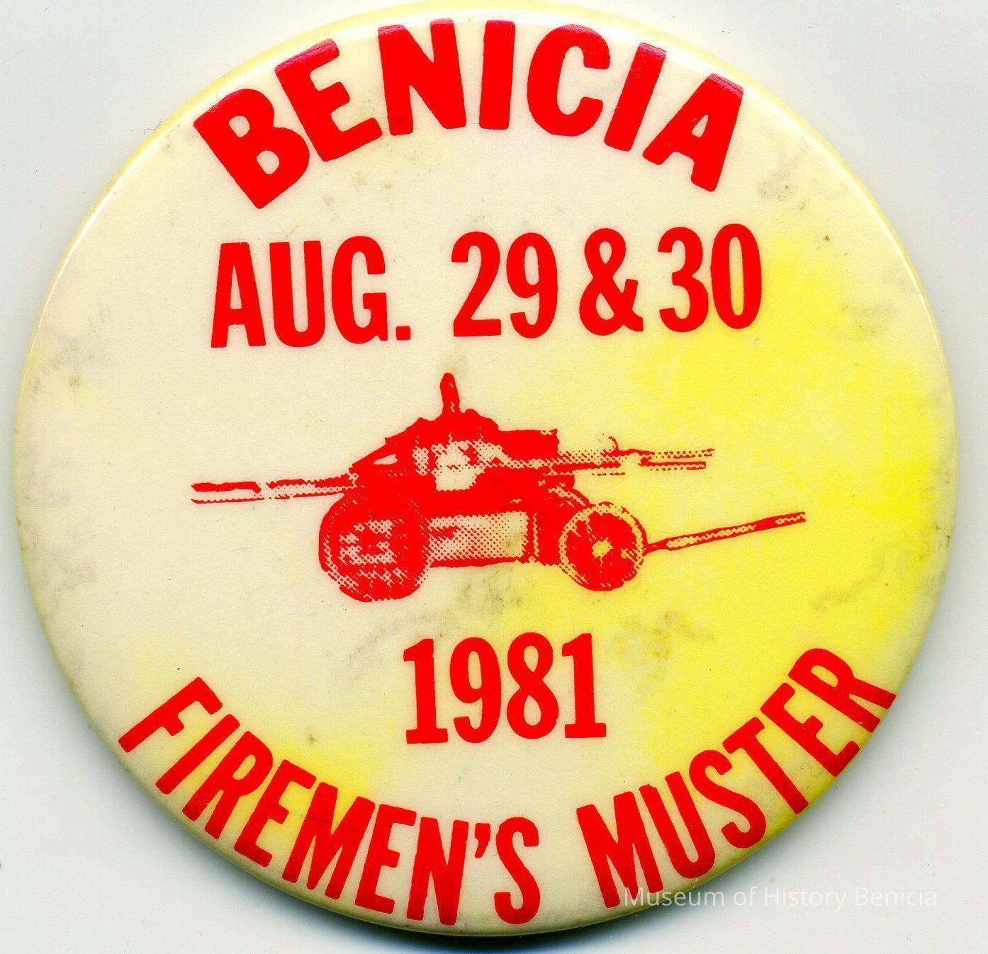 Button made for the August 29th - 30th 1981celebration of the Fireman's Muster in Benicia. It is a white button with red letters and is 2.25 inches in diameter. There is a drawing of an old hand pumper on the front.Collection