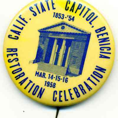 Button made for the 1958 restoration of the California State Capitol in Benicia. The celebration was held on March 14-16th, 1958. The button is 2 inches in diameter and is an off white or pale yellow color with a drawing of the front of the Capitol building in the center.Collection