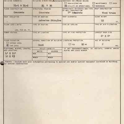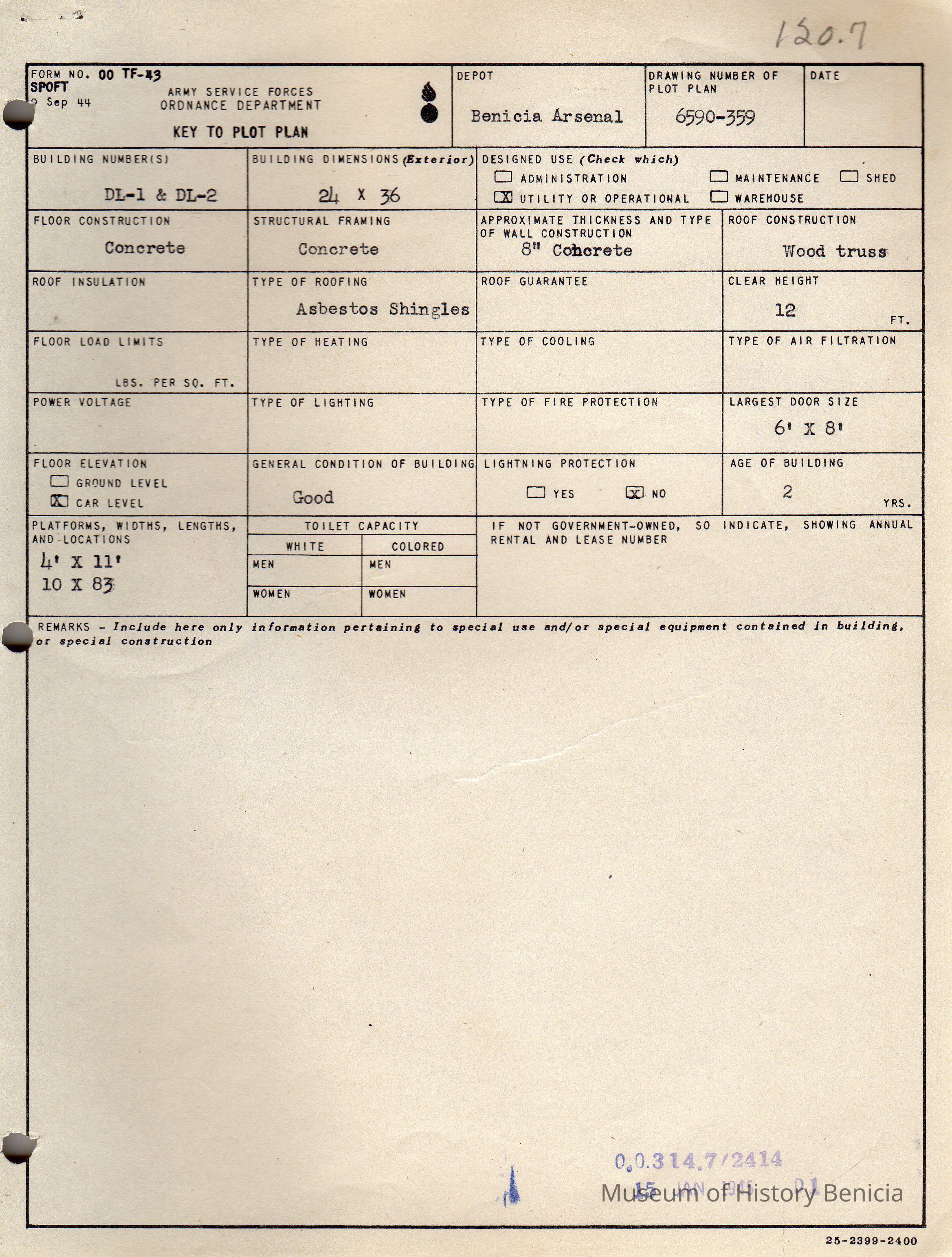 Benicia Arsenal Document. Form No. OO TF-43 SPOFT Army Service Forces Ordnance Department, Key to Plot Plan, Buildings DL- 1 & DL-2.Collection