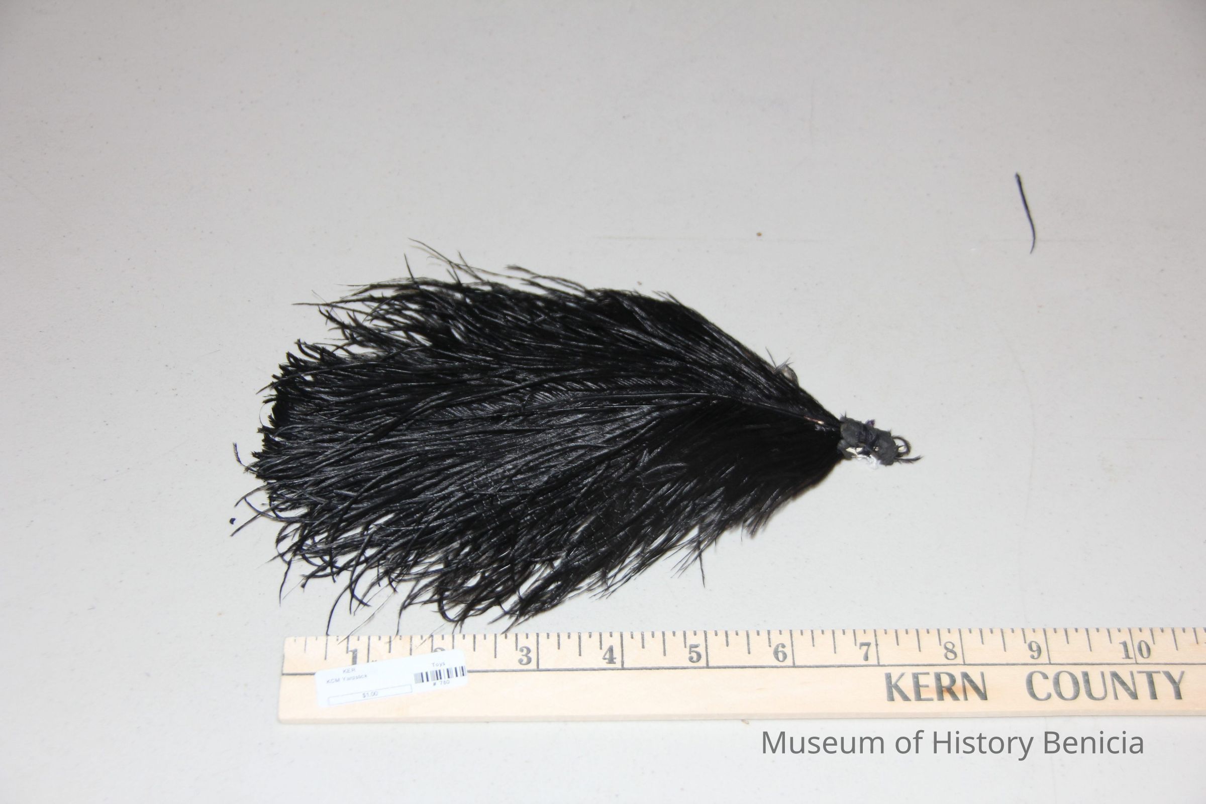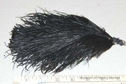 two short black feathers tied together. at the bottom still has a silky shine to it and in good condition.