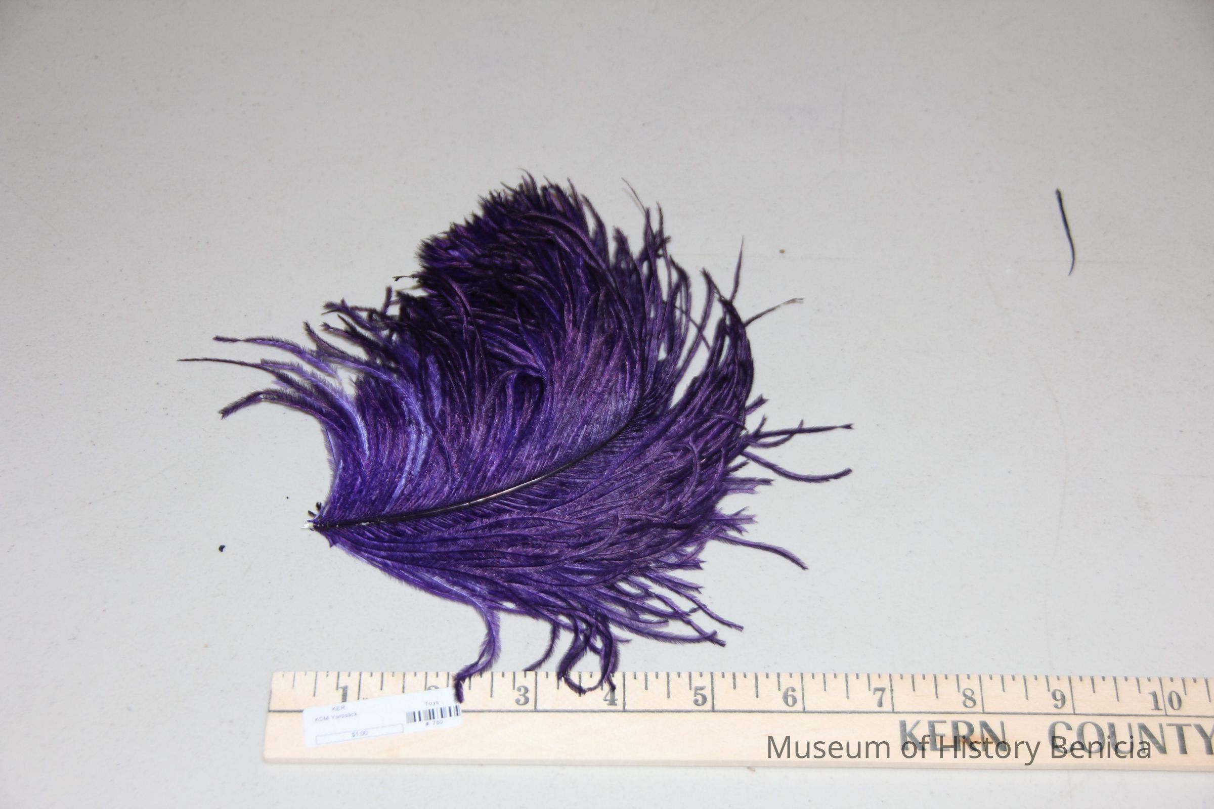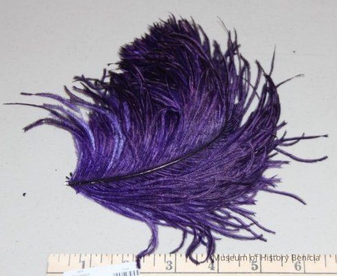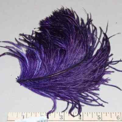 2 purple feathers tied together in fair condition. feather is bent upward.
