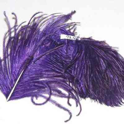three purple feathers tied together by a black string.