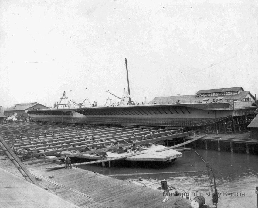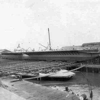 B/W Photograph: per reverse of the photograph: "ferry CONTRA COSTA , Southern Pacific shipyard at foot of Peralta Street, Oakland. The tugboat PORT COSTA , foreground." The train ferry is under construction. When built it measured 433 feet long by 67.2 feet across, with a draft of 18.5 feet. She displaced 4483 tons and was operated by two compound engines.