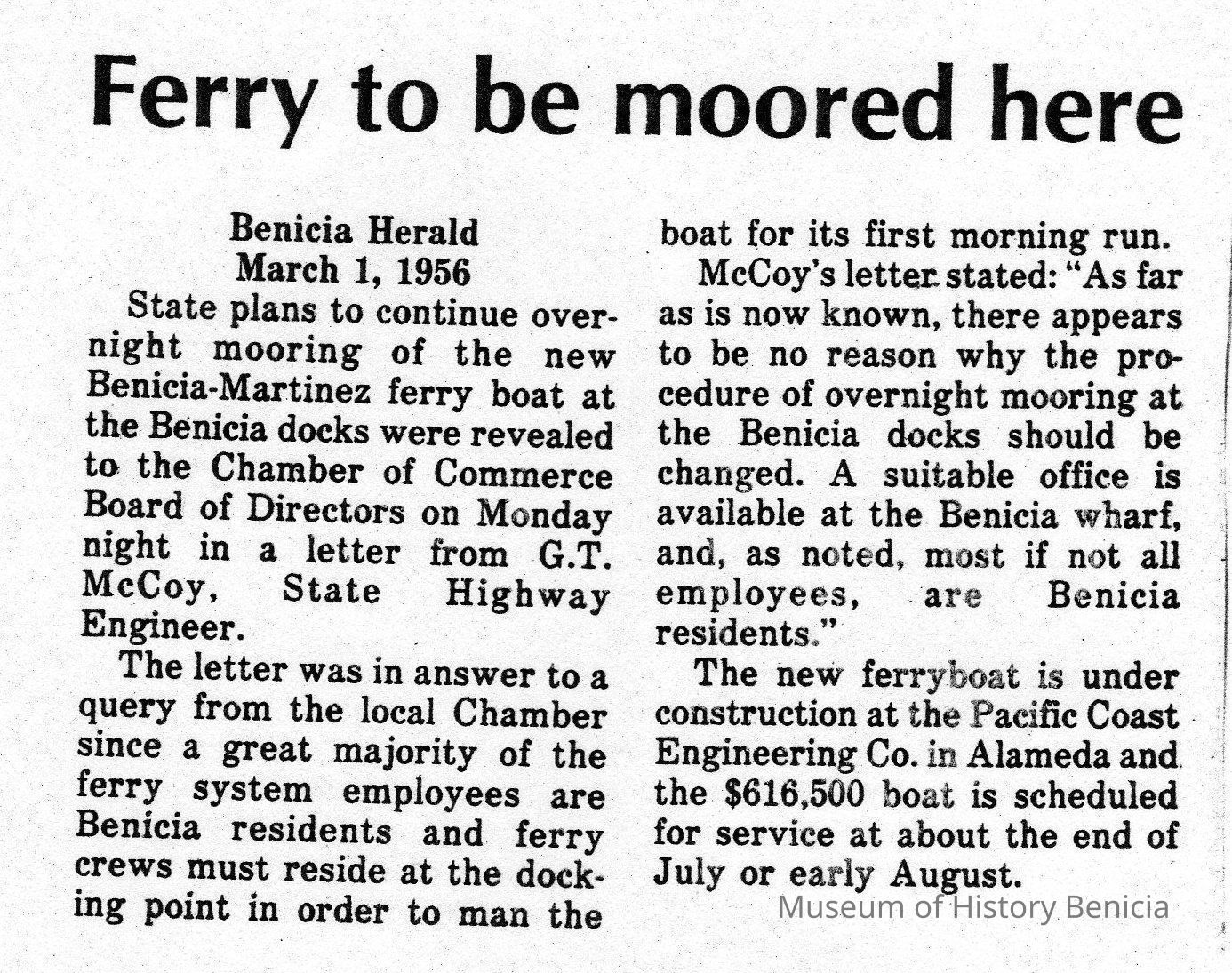 B/W photocopy of article run in the Benicia Herald on March 1, 1956, concerning plans to moor "the new Benicia-Martinez ferry boat at Benicia docks."Collection