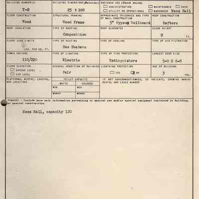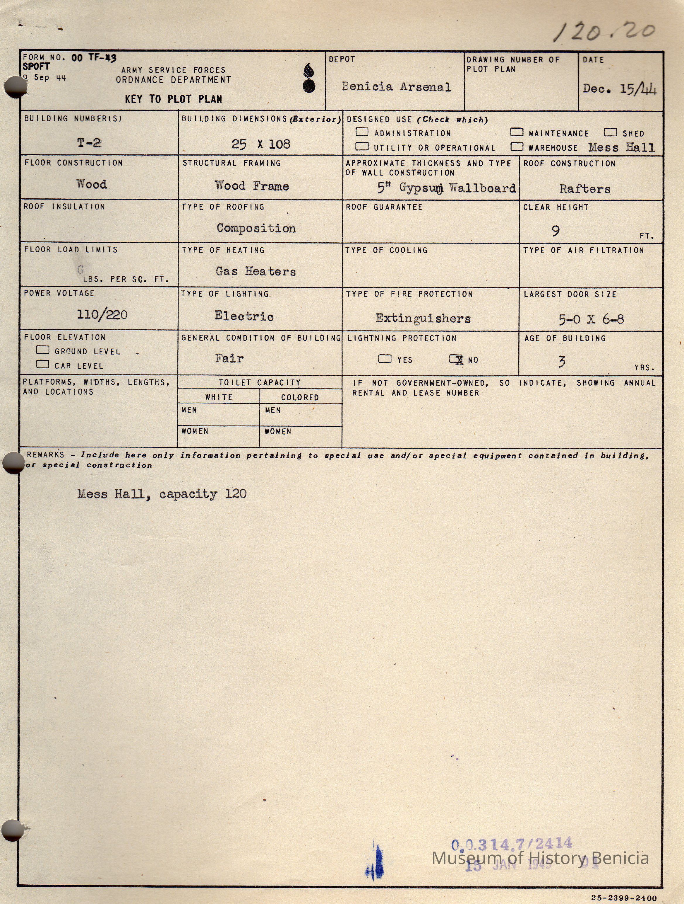 Benicia Arsenal Document. Form No. OO TF-43 SPOFT dated Dec. 15, 1944 Army Service Forces Ordnance Department, Key to Plot Plan Building T-2 Mess Hall.Collection