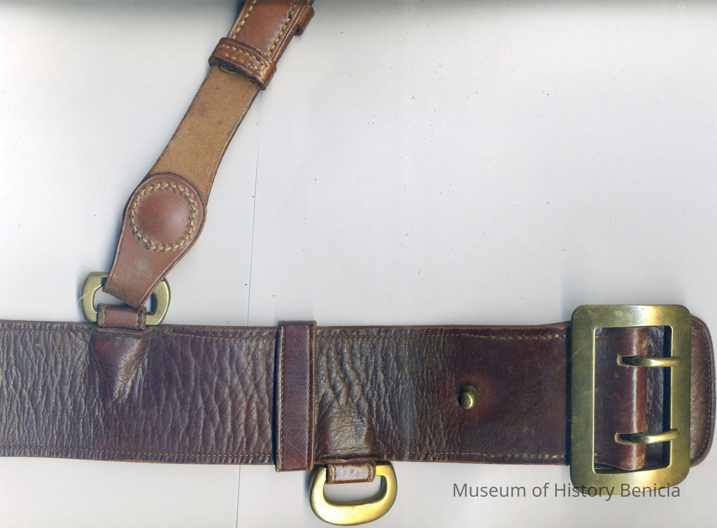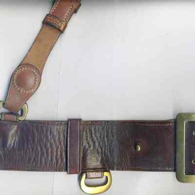A leather belt belonging to Oscar Zar Warner from WWI. It is about 2.25 inches wide. It has a metal clasp/buckle. There is a leather attachment on one side which looks like a small belt by. It may be the belt used to carry a sword.Collection