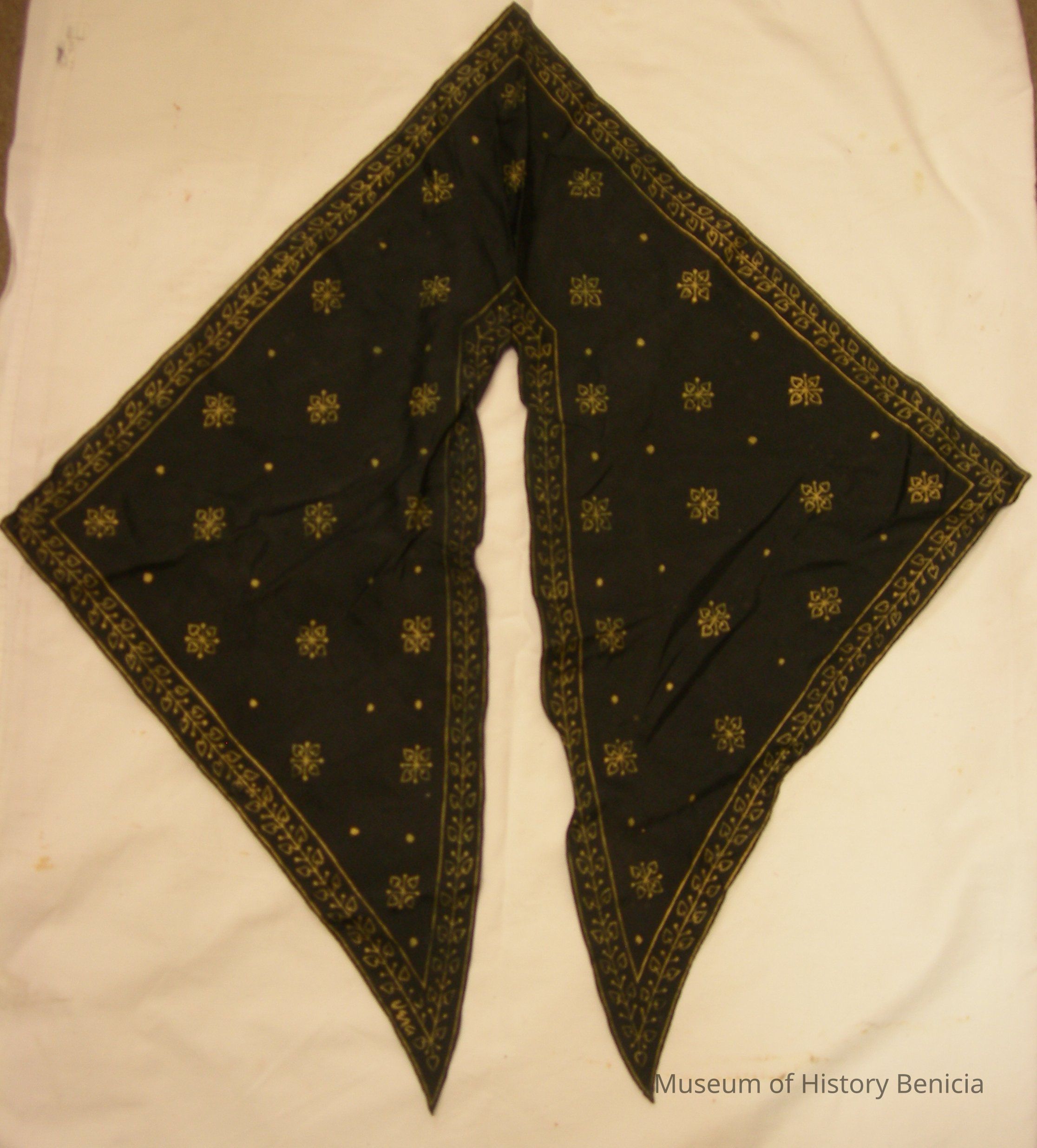Fichu - black silk with gold design and border; triangular shape; two pieces connected at the back: 15-1/2" x 15-1/2" x 24"