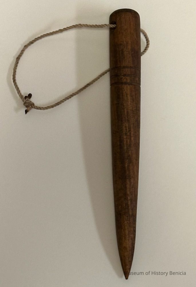 This fid is 8 1/8 inches long, has a string through a hole at the top, and has three circular grooves which wave been carved.Collection