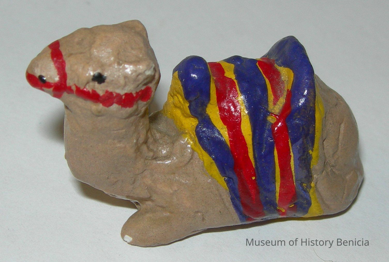 Small glazed chalkware, sitting camel; brown with red, yellow, and purple accents representing a saddle blanket