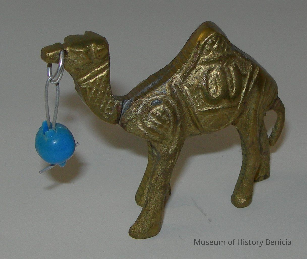 Bronze standing one-hump camel with a blue ball on a wire on a ring through its head