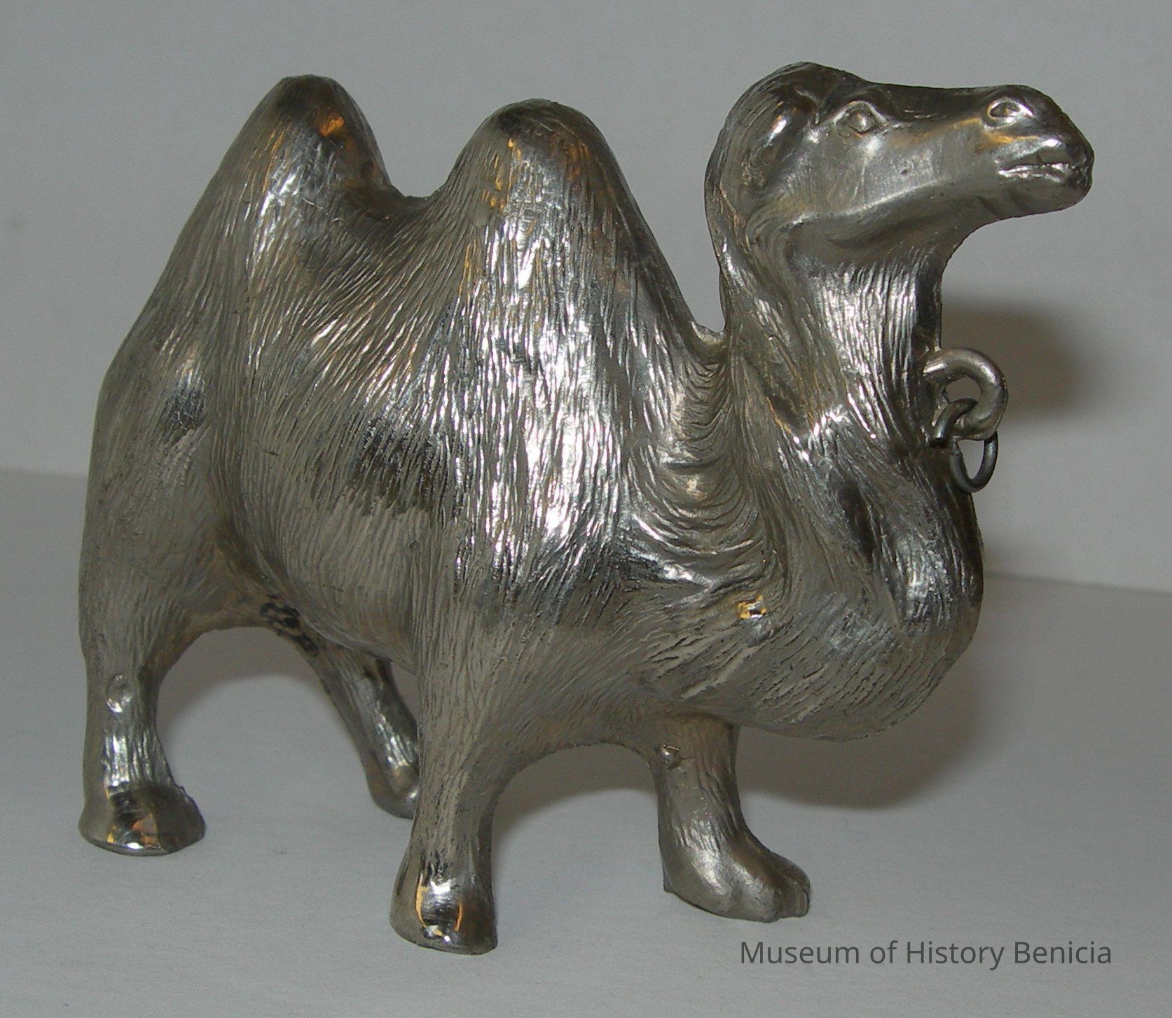 Silver colored metal standing camel, hollow with ring at front neck "Made in Japan" in raised letters on stomach area