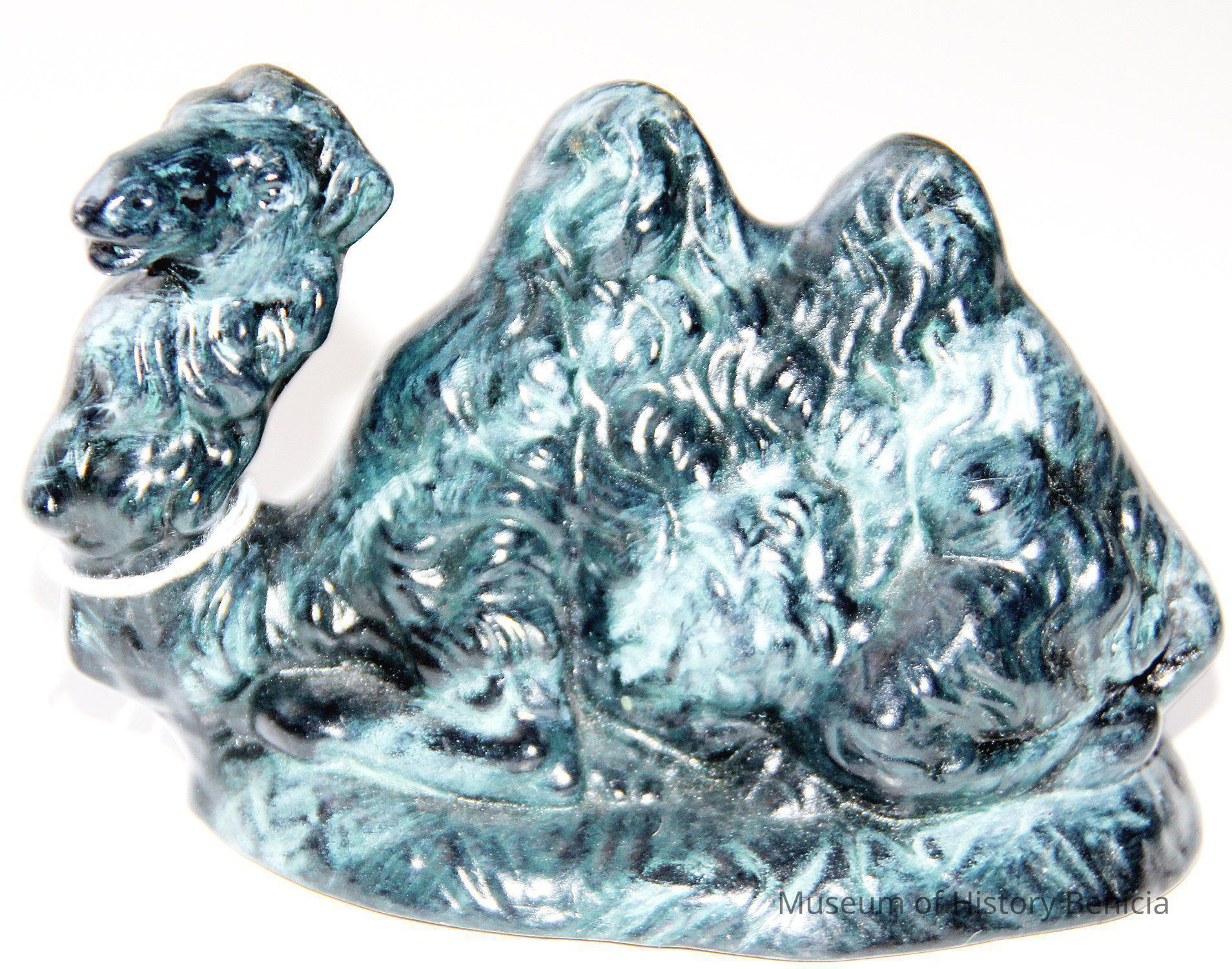 Green painted ceramic camel. It is sitting down and has two humps.