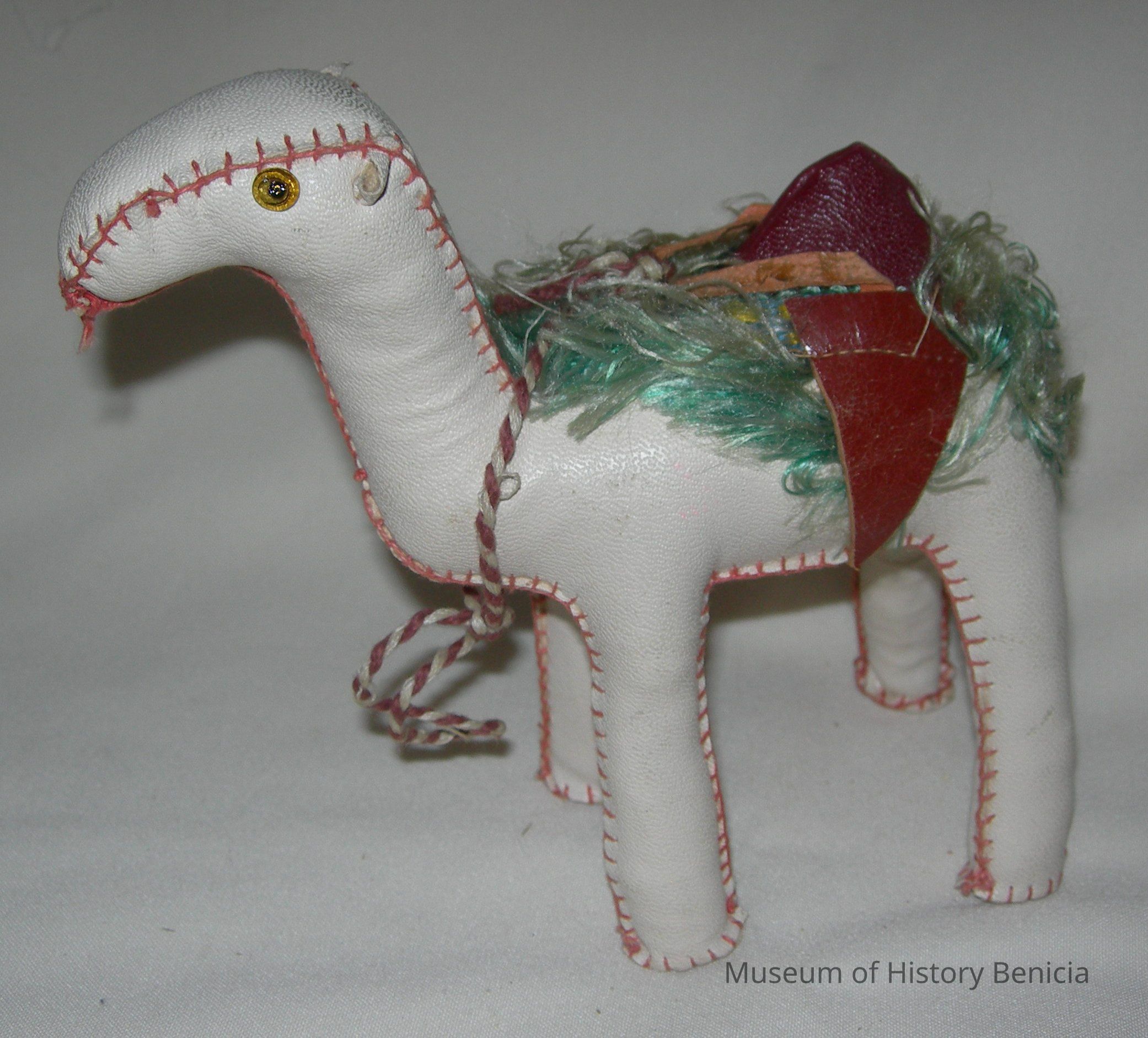 Artistic dromedary camel in standing position made of white leather sewn with brown thread; brown saddle with greenish fringe, one eye is missing; a lozenge-shaped ornament is suspended from the nose.