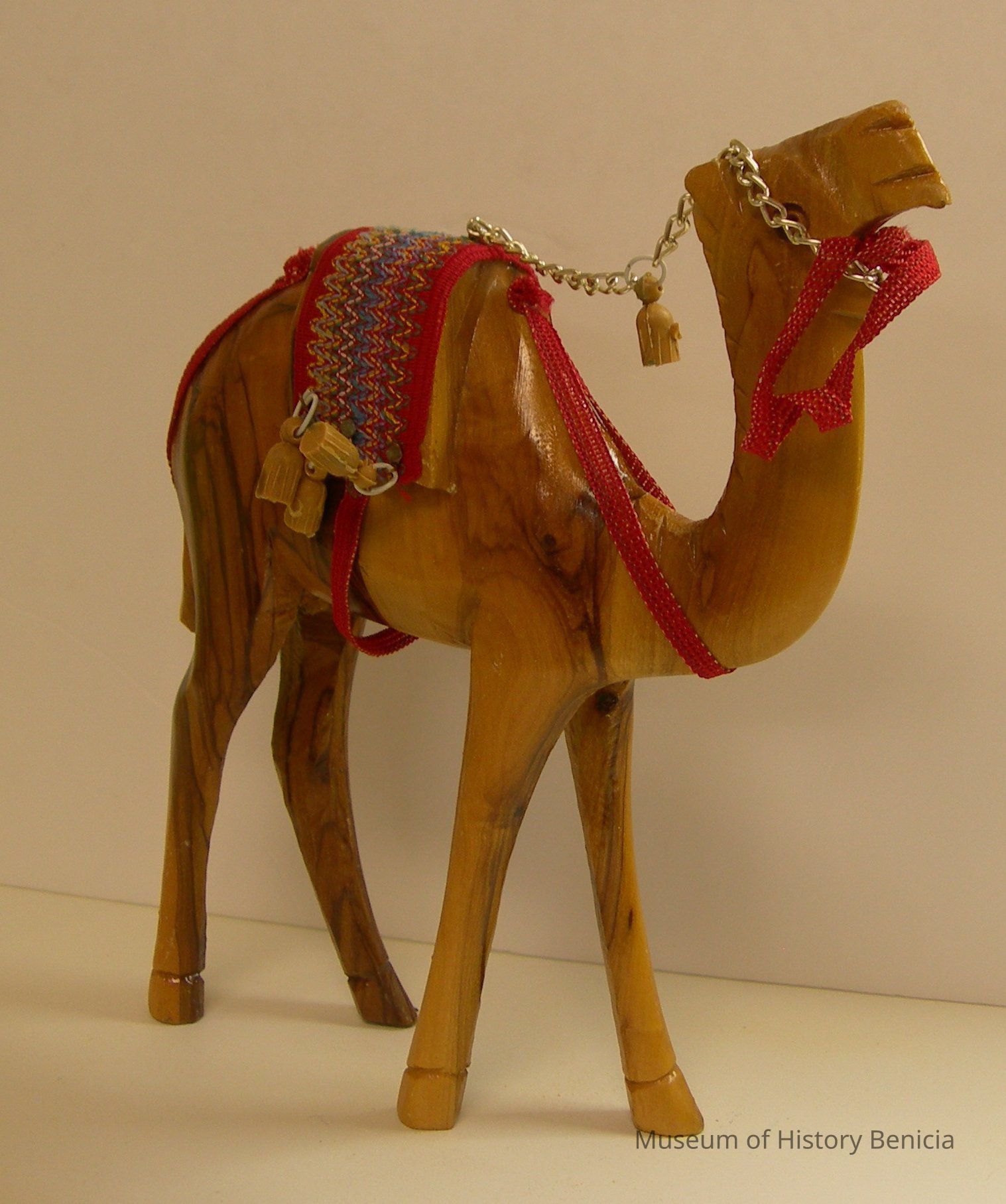 Large wood camel with its head raised. It has a bright/colorful cloth saddle, reins, and water jugs.