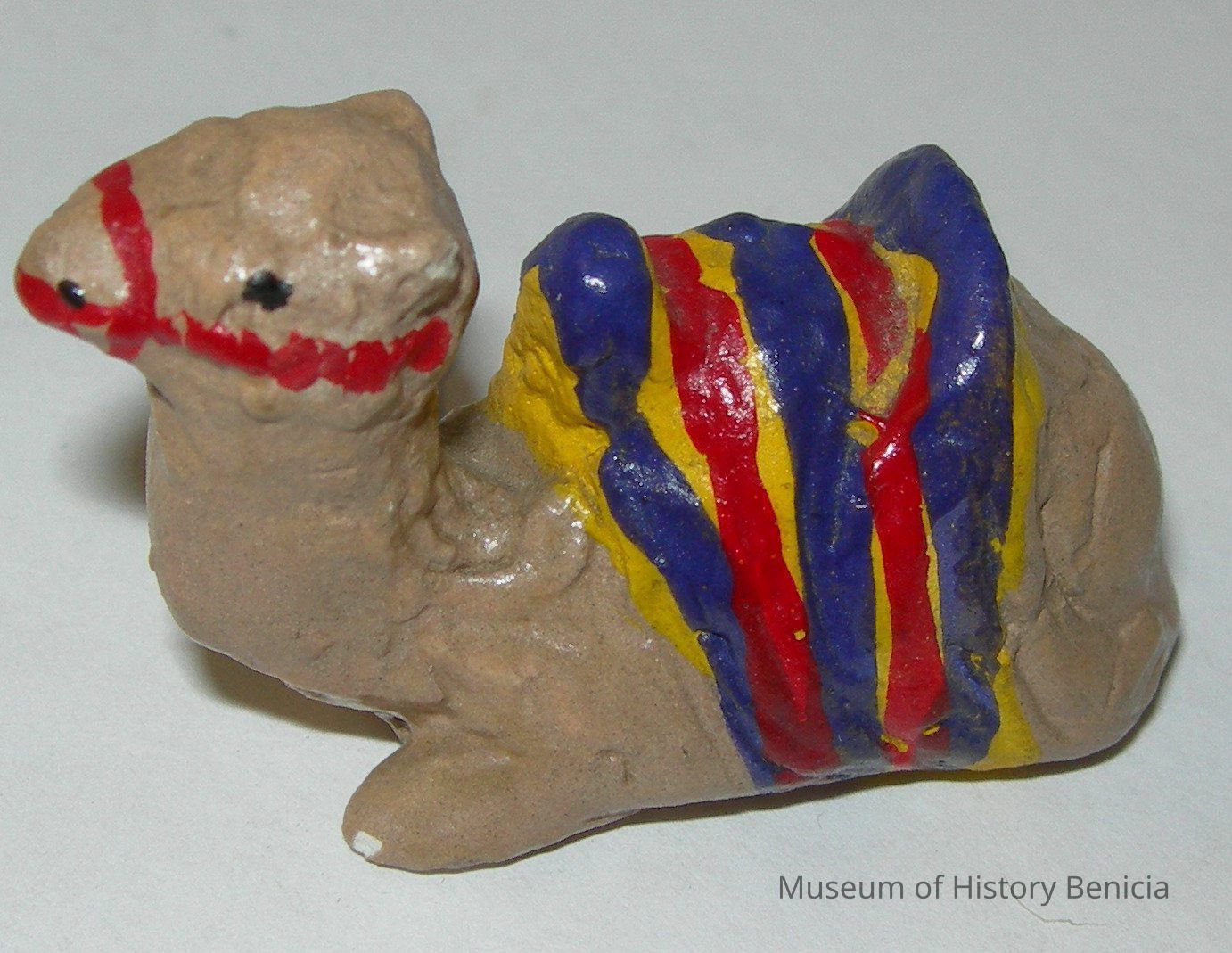 Small glazed chalkware, sitting camel; brown with red, yellow, and purple accents representing a saddle blanket