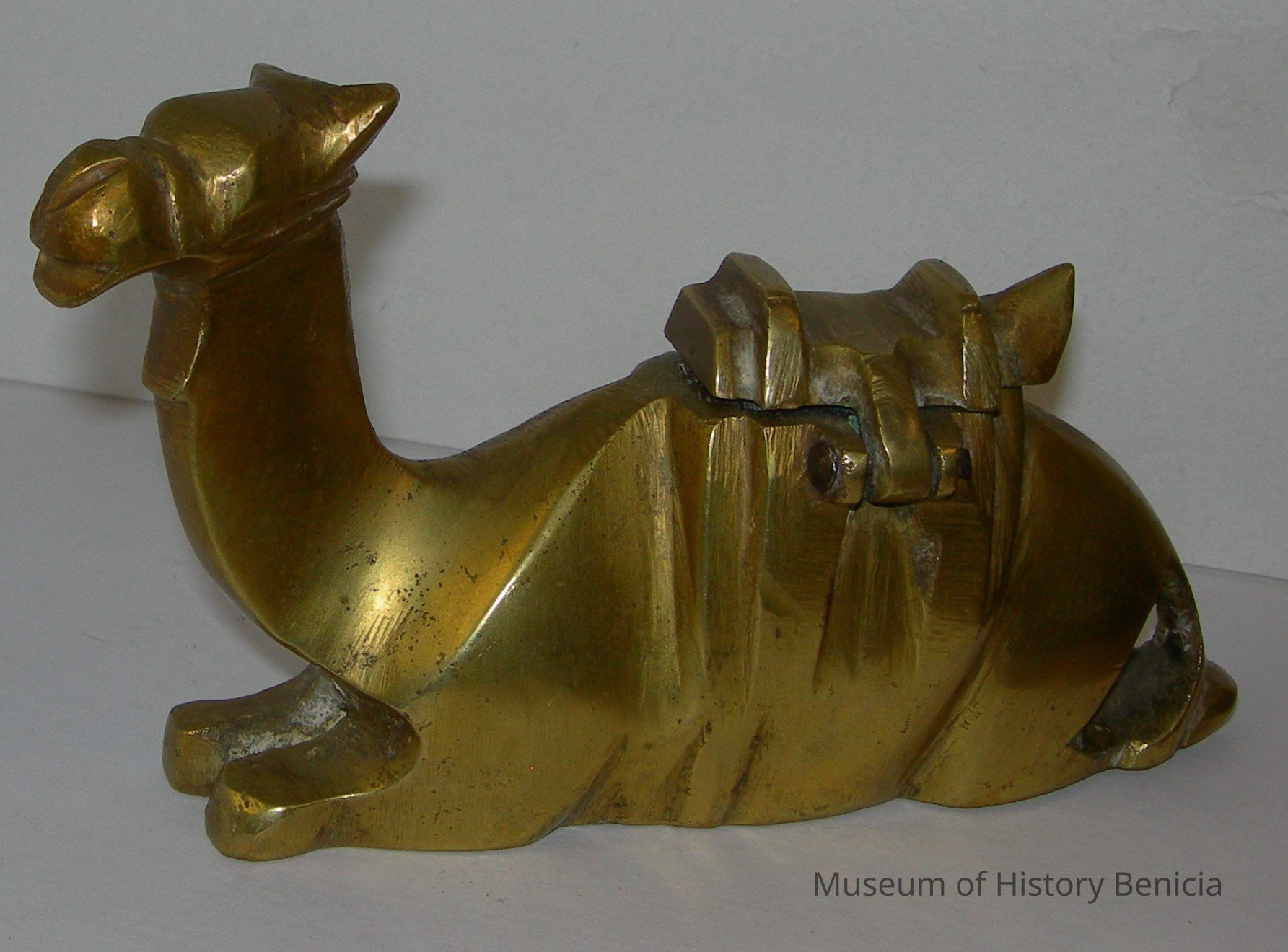 Brass camel in a sitting position. The hinged saddle opens to a hollow inside. It is unknown what the camel may have contained, if anything.