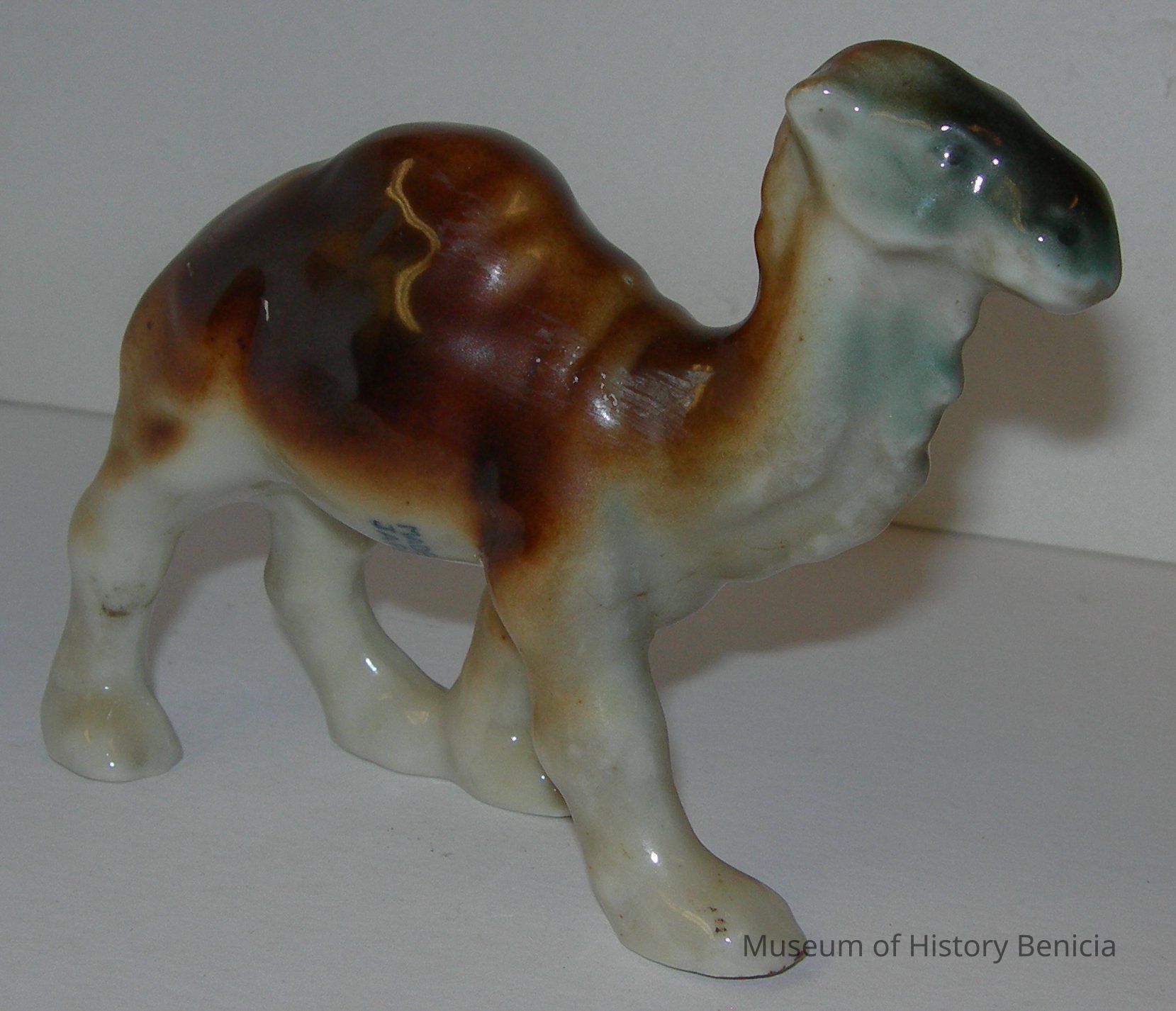 Glazed ceramic, standing, tan and brown, one-hump camel. It is has black glaze on its face. It is stamped "Made in Japan" on its stomach.
