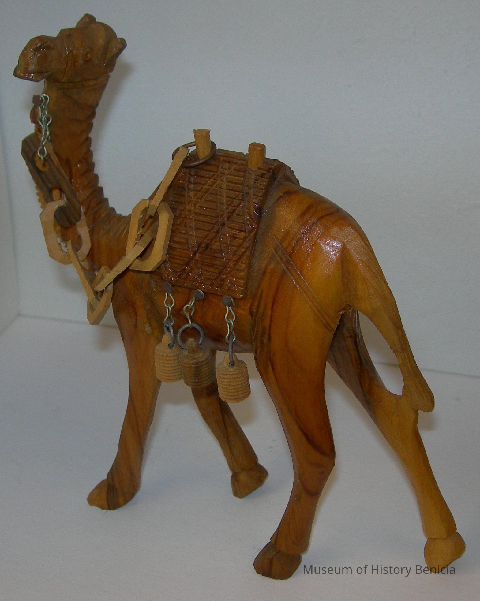 Carved, wooden, standing camel with its neck craned to one side. Looks to be machine stamped and cut. Has saddle with two pegs sticking up and a diamond pattern cut into it with six jars dangling from chains (three on a side). Has interlocking wooden pieces hanging from its halter. It is a natural wood color that has a semi-gloss finish.Collection