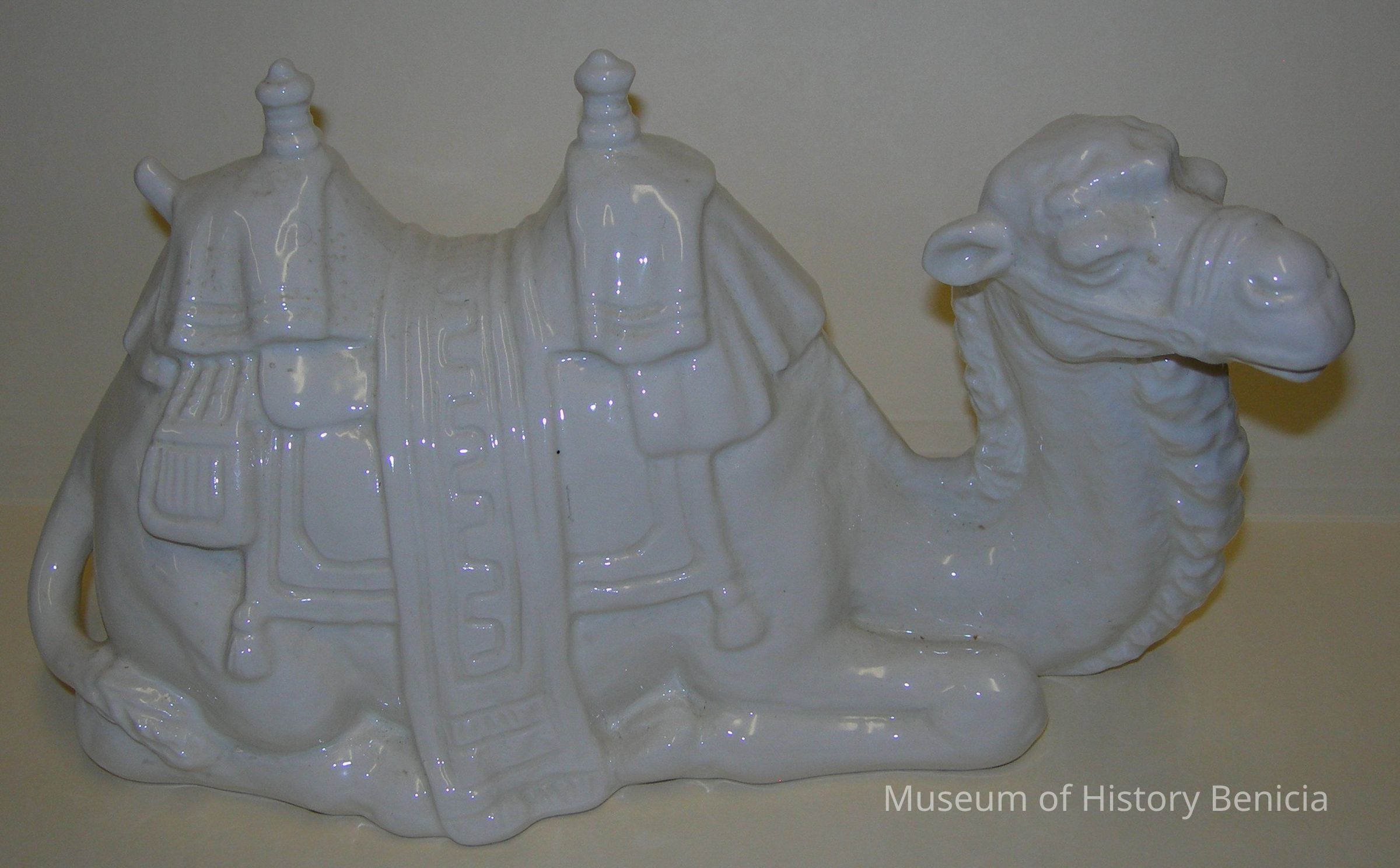 white ceramic camel with saddle in laying down position. made by Goebel of W. Germany (before reunification) on bottom: #46821-77