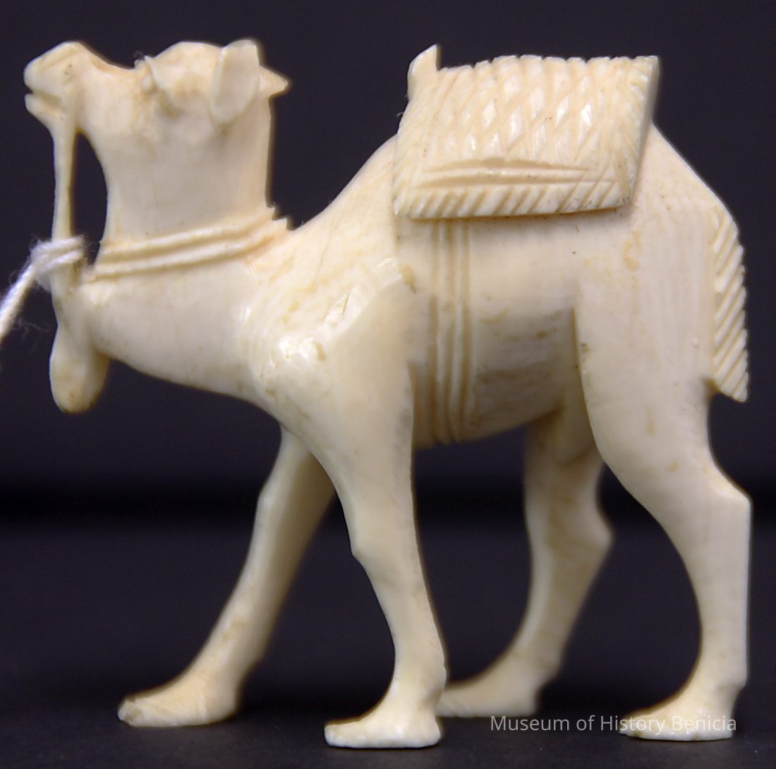 Camel ivory with camel saddle, blanket , and reins.