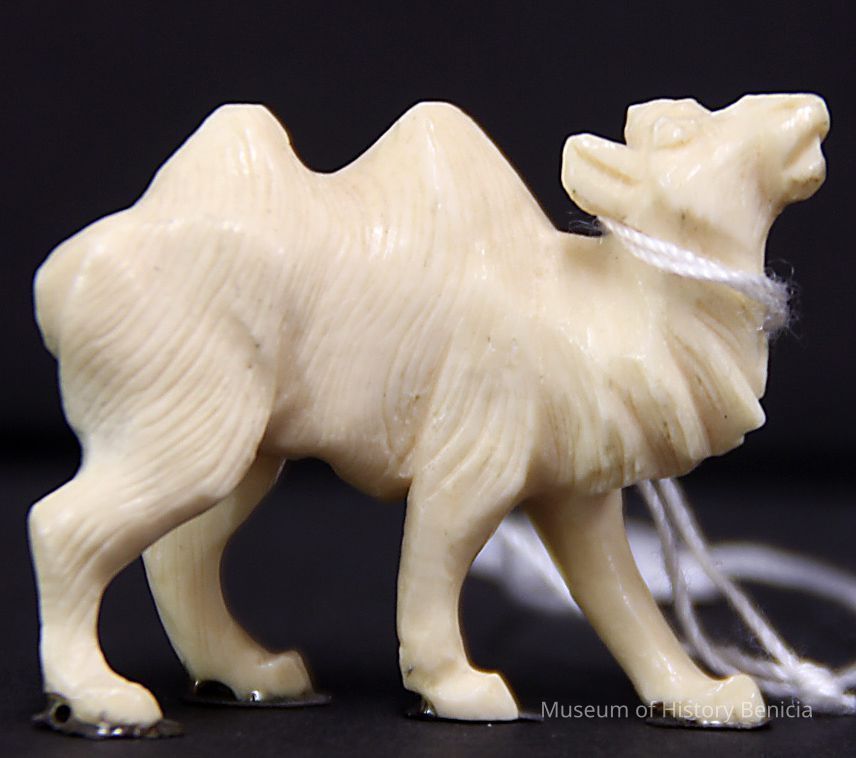 Camel bone with no saddle or reins. The camel has two humps and is curved. the feet have green stuff on them like they were glued down to something at one time.Collection