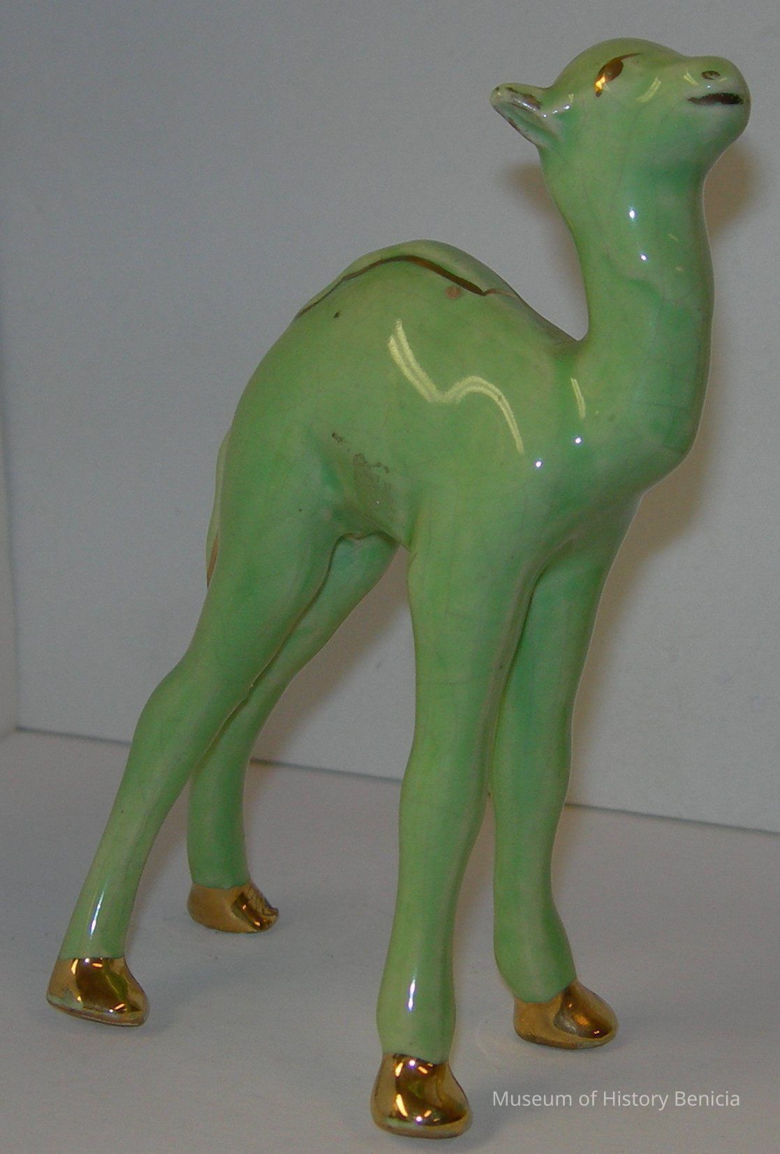 Light green, standing camel with gold highlights (eyes, back/tail, hooves). It is made of glazed ceramic.
