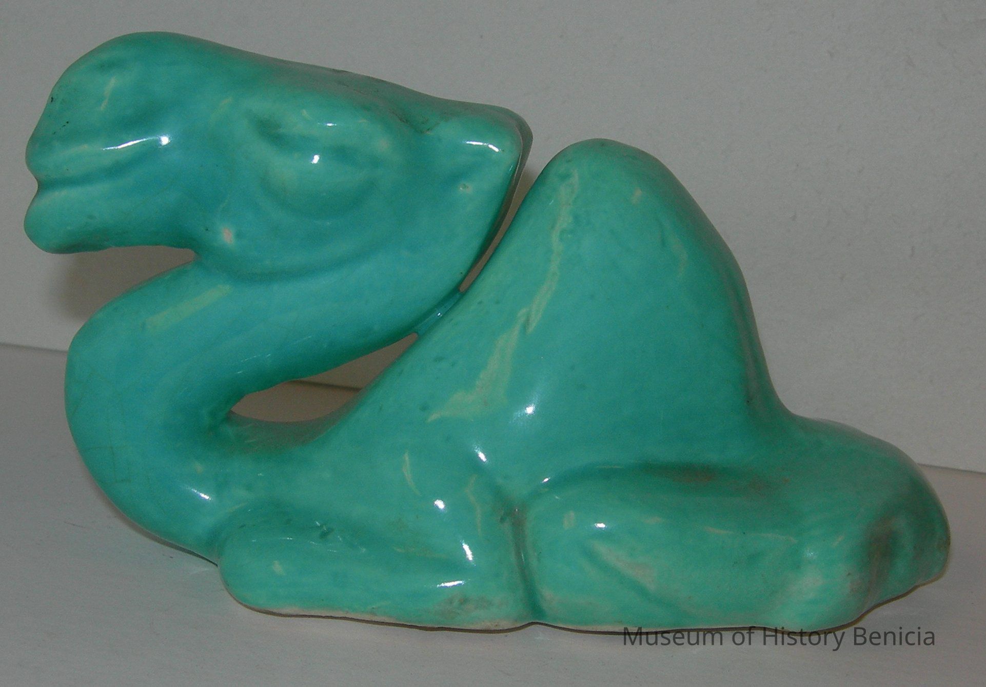 Light greenish-blue glazed porcelain camel at rest. The hump and head are the same height and both are exaggerated in size. There are no paint markings on the bottom.Collection