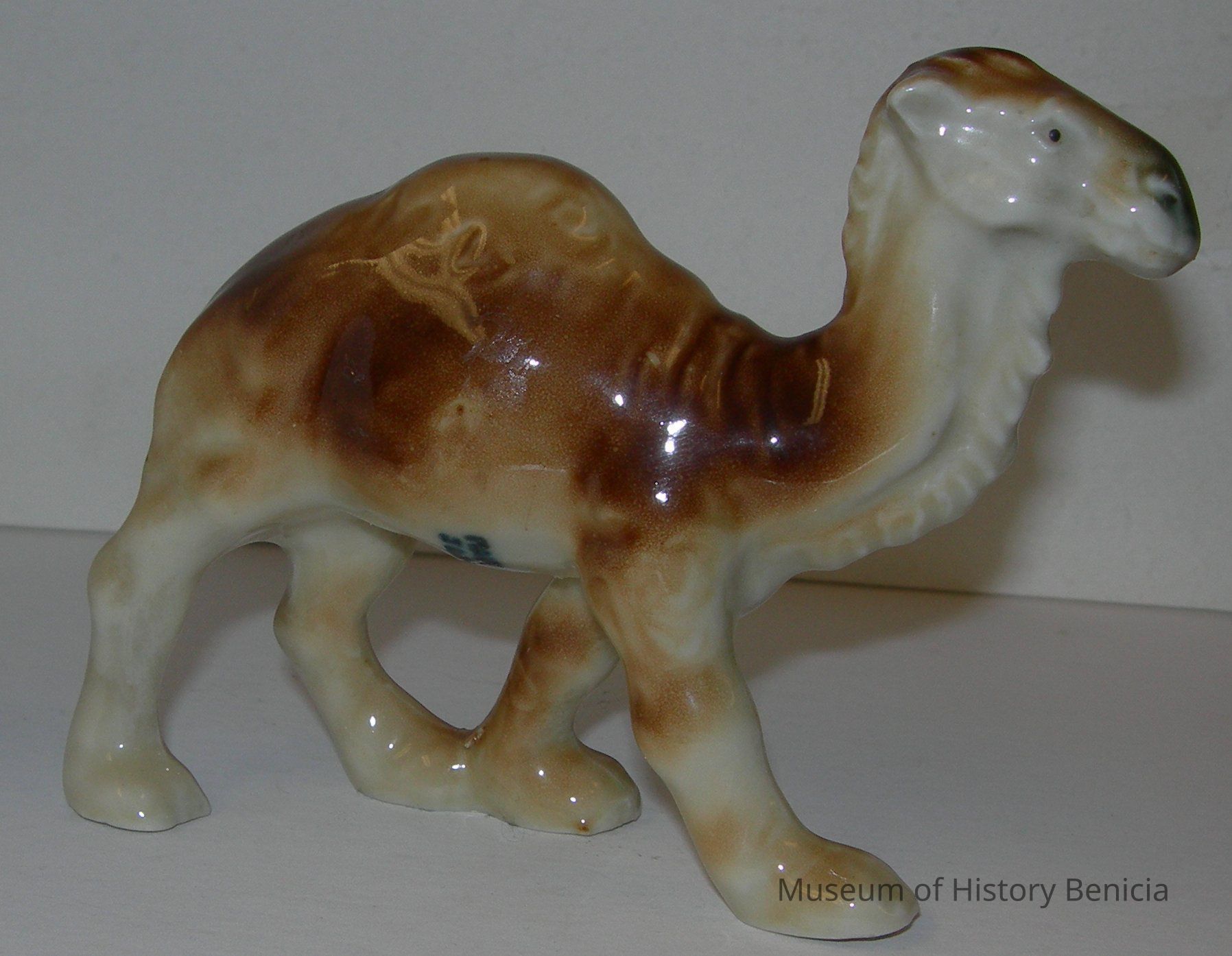 Ceramic, walking brown and tan camel with one hump. On the bottom of the two left hooves is written "Ella", and on the bottom of the right front hoof is written 1953. It is also stamped "Made in Japan" on the stomach.Collection