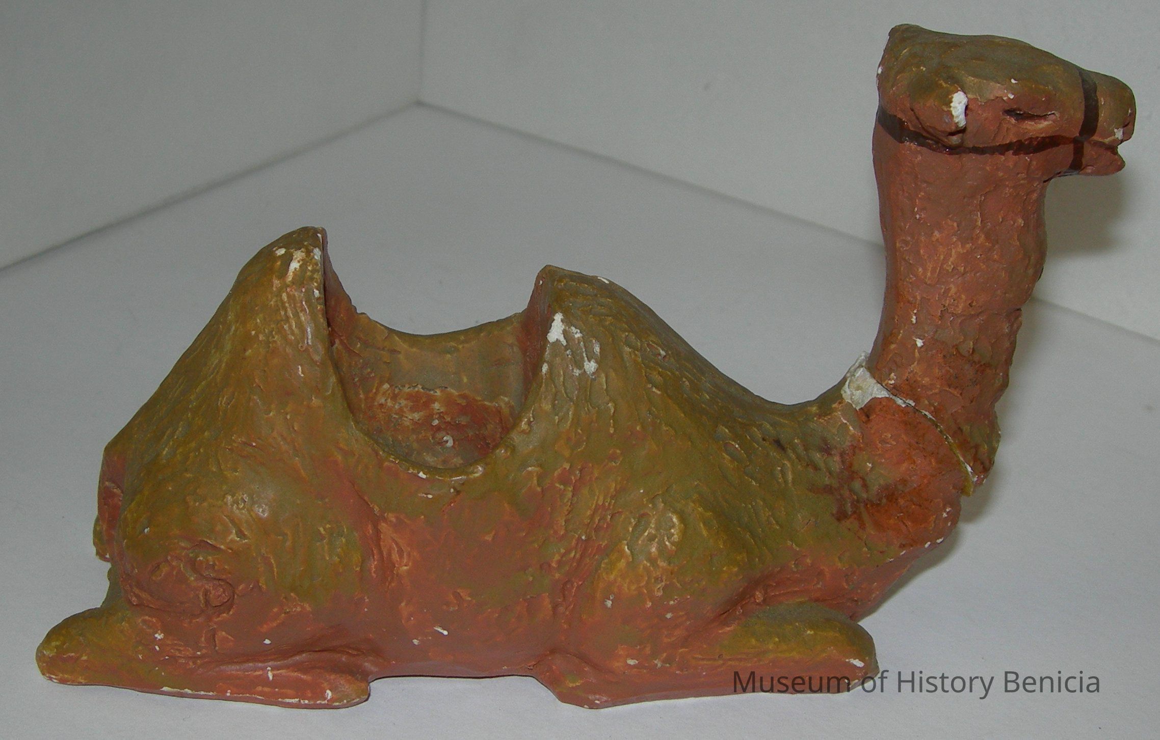 Reddish-brown, open humped camel at rest. The neck has been broken and has been repaired. It has a dark brown halter painted on its head. The mouth, nostrils and closed eyes are also painted on.Collection