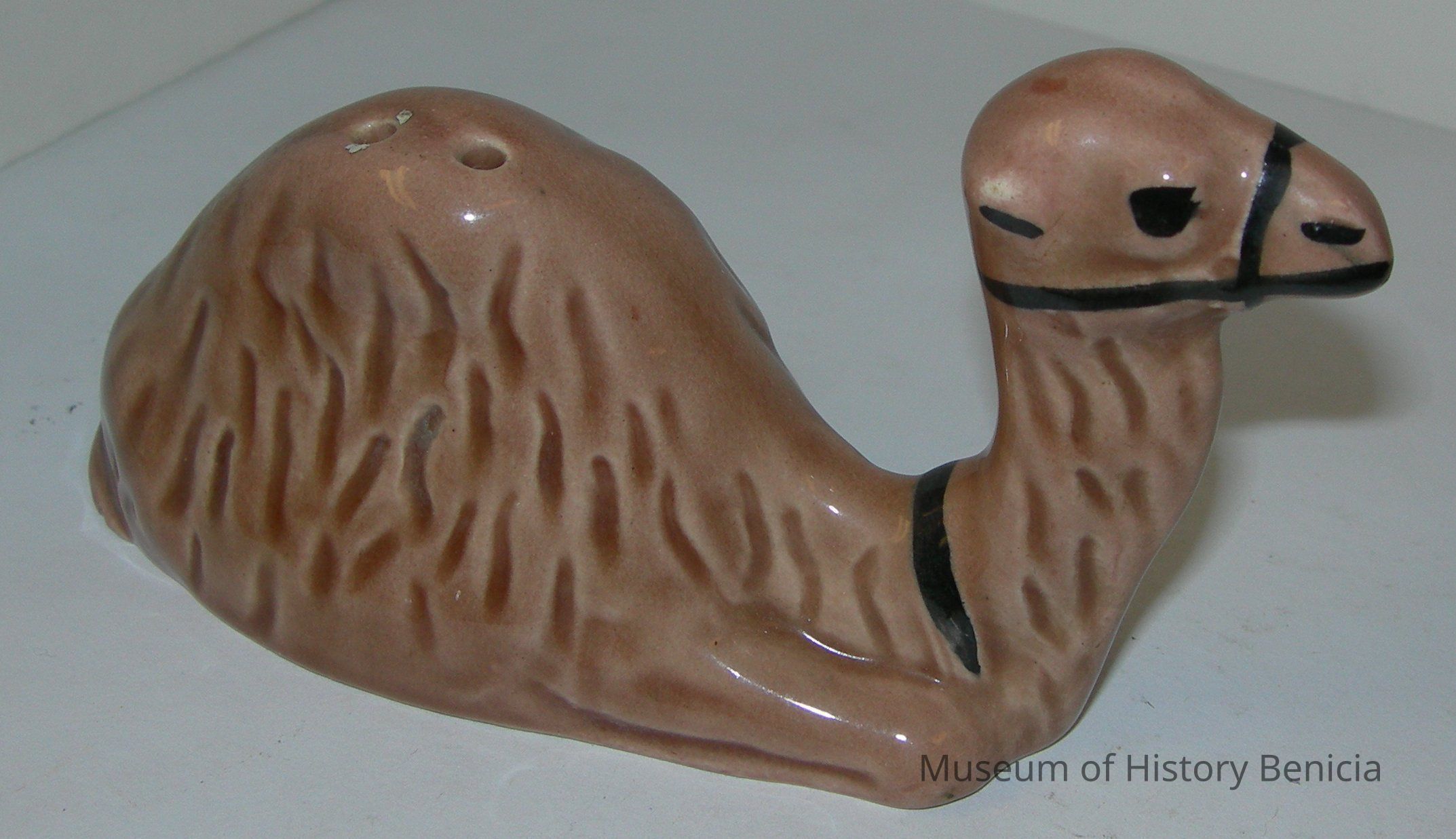 Glazed, tan colored, salt shaker (two holes in top). One-humped, resting camel with "hair" marked into the body. Has a black halter around the mouth and neck. The eyes, nostrils and ears are also painted black.Collection