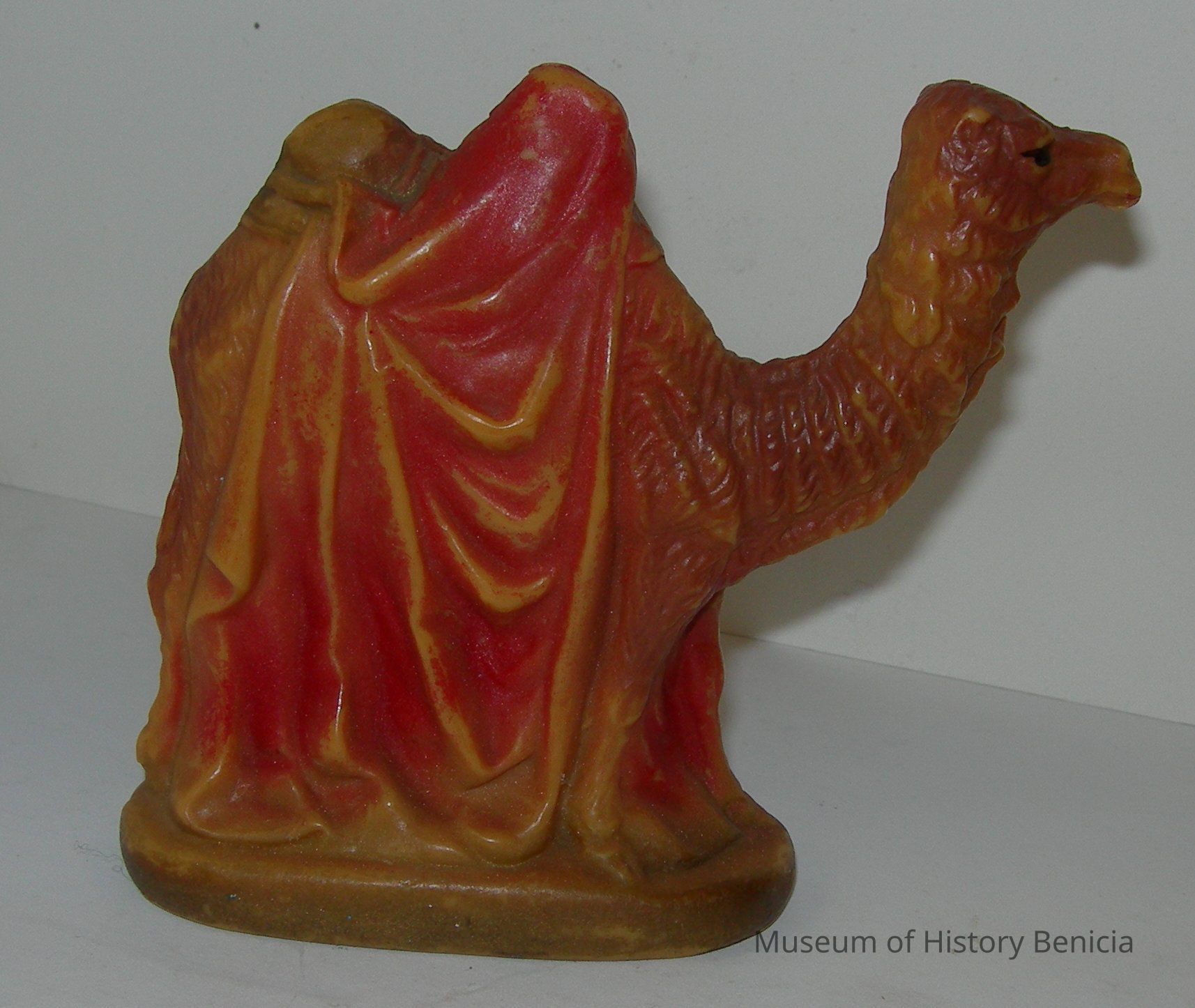 Two-hump, standing camel. It has a red blanket sweeping down from the front hump. It is molded from plastic.