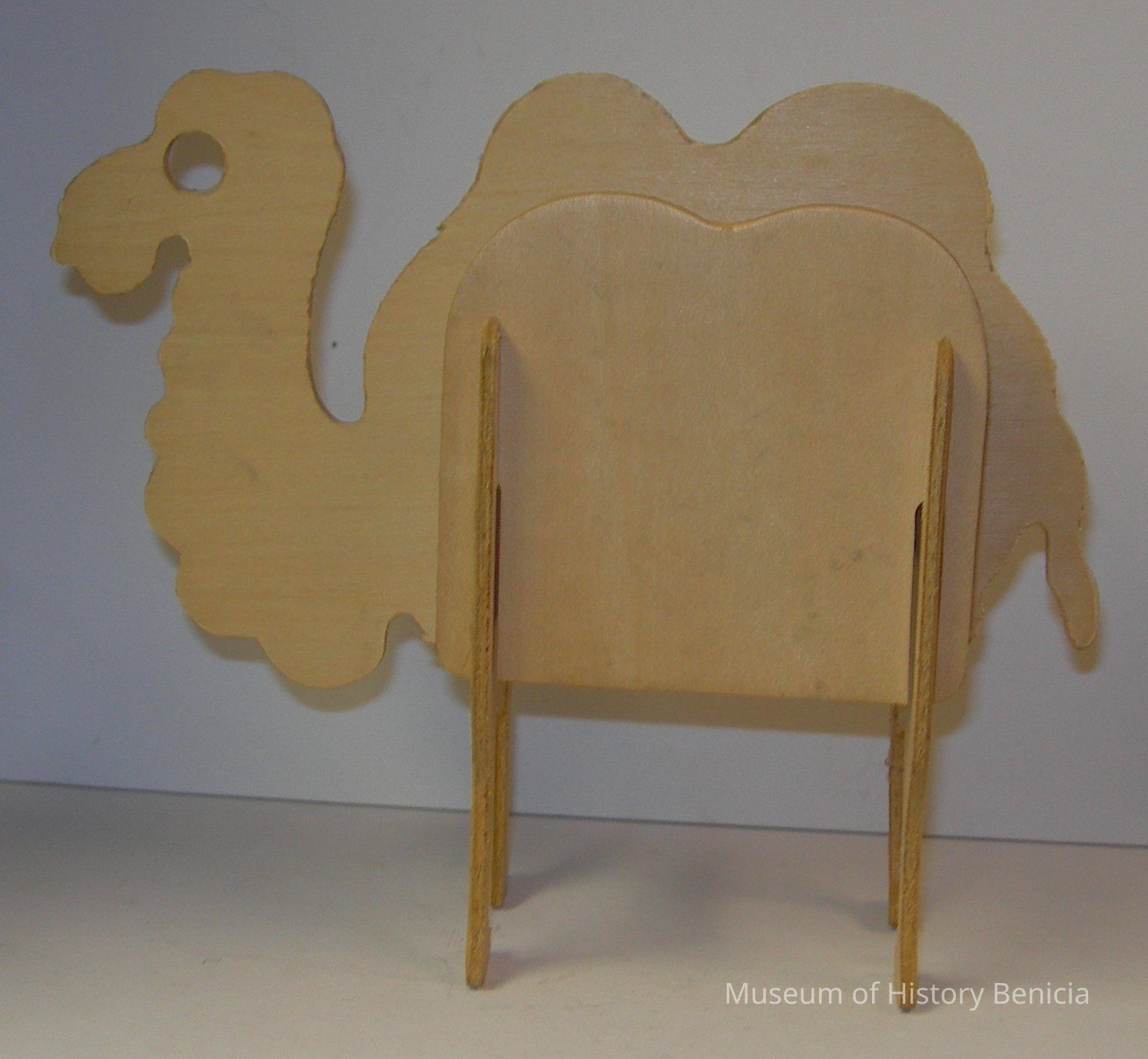 Standing camel made of six pieces of light weight wood, cut to interlock with each other. No glue is used.